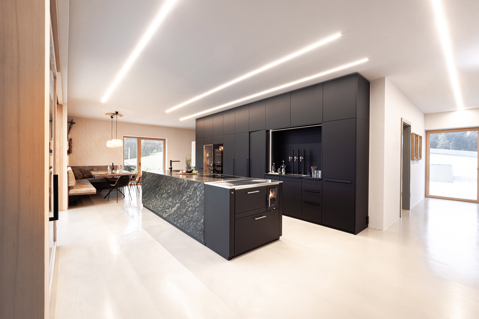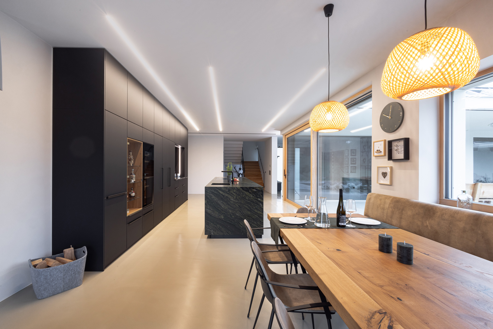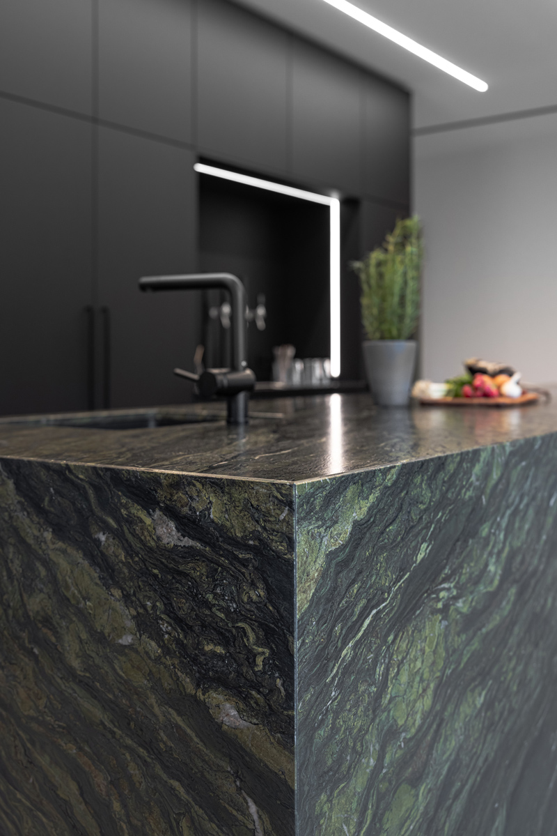 Auffallend: Der Inselblock mit grünem Naturstein kombiniert zu schwarzen, supermatten Küchenfronten. Die raumhohe Küchenzeile schafft maximalen Stauraum und integriert dezent den Eingang in die Arbeitsküche. Nischen mit integrierter Beleuchtung bieten zusätzliche Arbeitsflächen und setzen spannende Akzente. Als Gegenpol zur modernen Küche wird eine Essgruppe aus Massivholz gekonnt in Szene gesetzt.