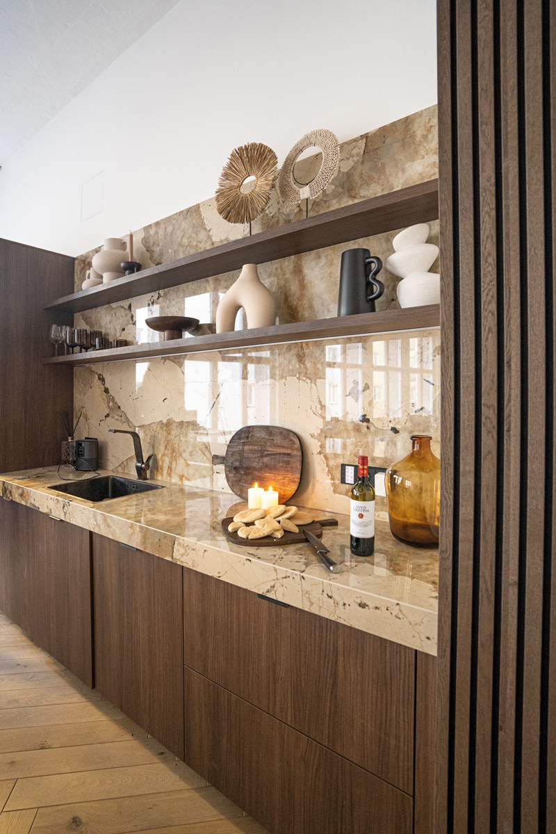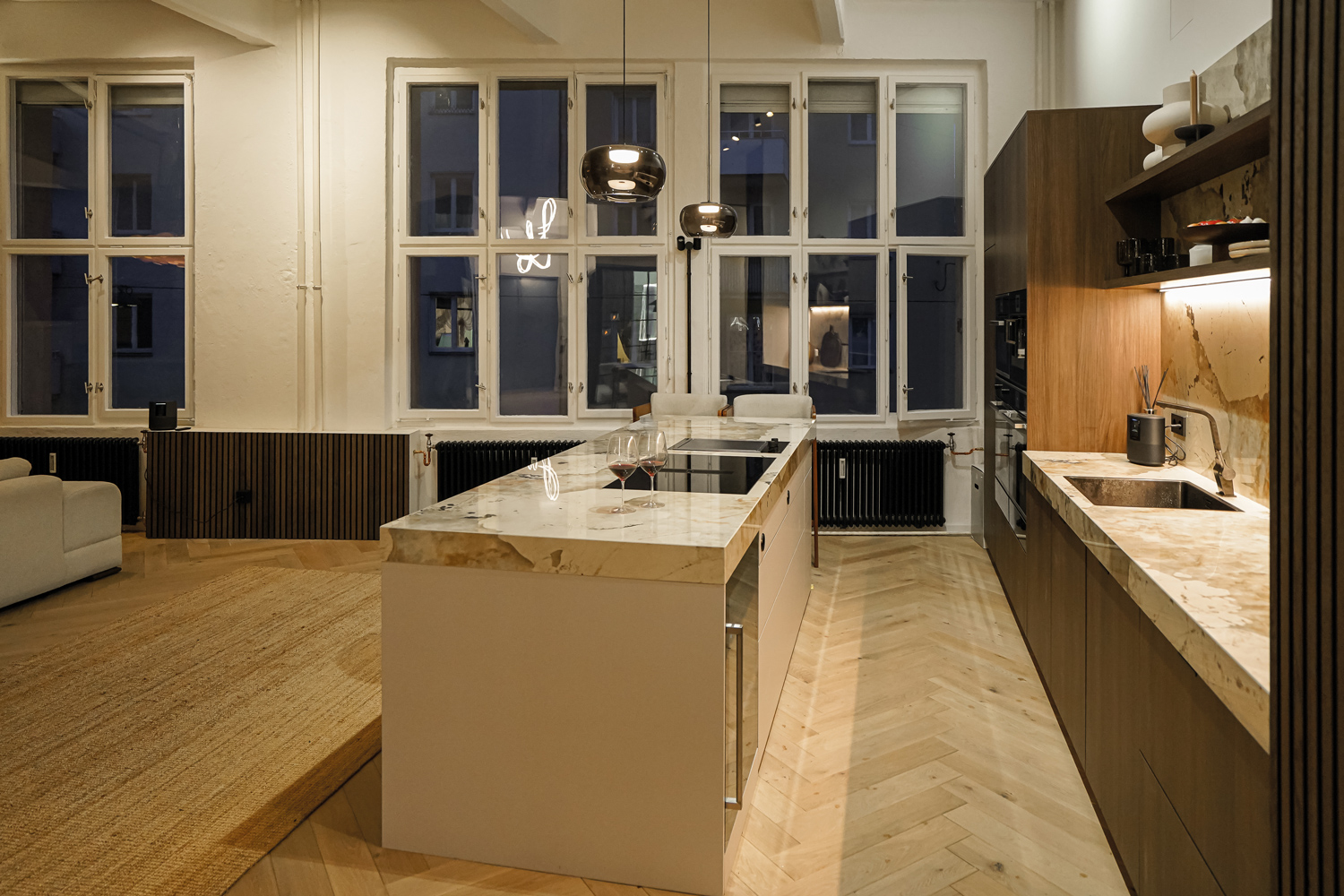 Die Kombination aus dicker Kunststein Arbeitsplatte und dunklen Holzelementen sorgt in dieser Loft-Küche für Gemütlichkeit. Die Küchenfronten aus dunklem Holz verleihen dem hohen Wohnraum einen Touch Gemütlichkeit, während die geradlinige Form der Kücheninsel und das Spiel mit offenen Regalen in der Küchenzeile den luftigen, offenen Charakter des Wohnraums perfekt unterstreichen.