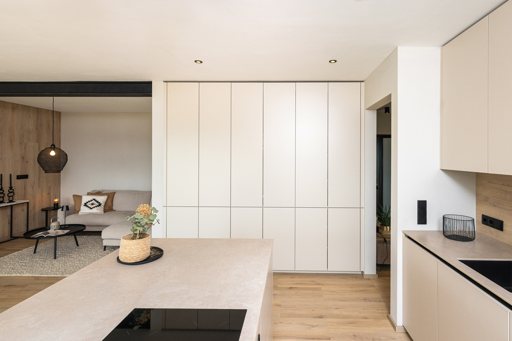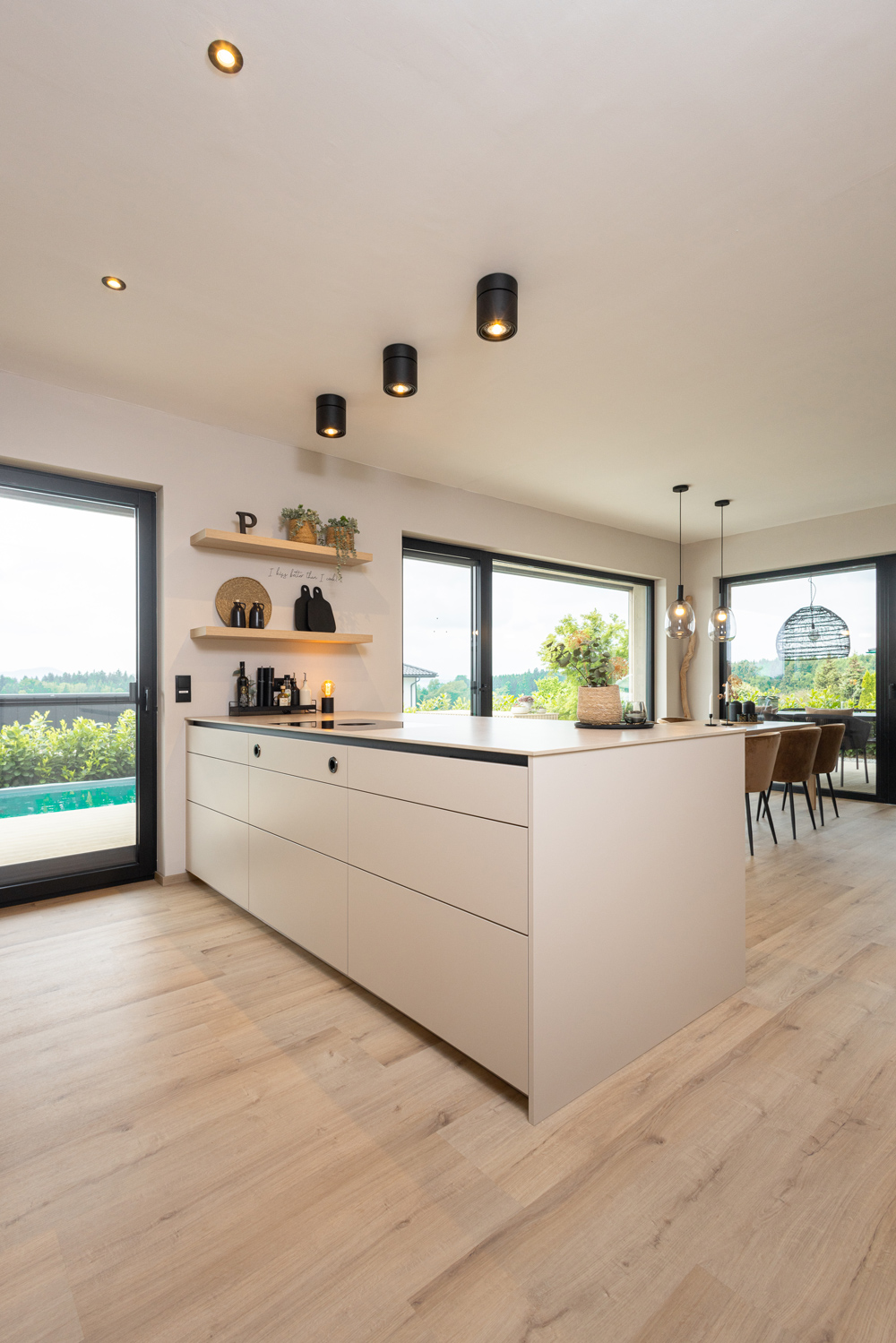 Ton in Ton: Sanfte Farben in Erdtönen liegen im Trend und entspannen Geist und Seele. Die geradlinige Formensprache dieser Traumküche harmoniert mit den grifflosen Küchenfronten und der raffinierten U-Form, die aus Kücheninsel und Küchenzeile gebildet wird. Die integrierte Theke der Kücheninsel unterstreicht die Verbindung zum offenen Wohnraum mit großzügiger Essgruppe und lichtdurchflutetem Ambiente.