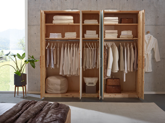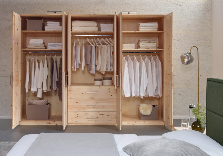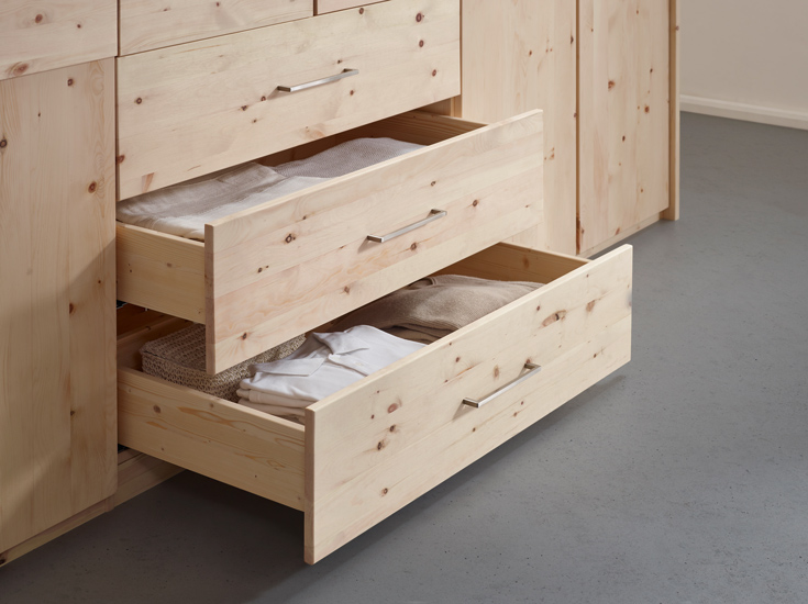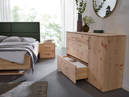 Die alpenländische Zirbe modern interpretiert? – Diese Schlafzimmermöbel-Linie aus österreichischer Fertigung verbindet die urwüchsige Kraft der Zirbe mit einer trendigen Formensprache. Das geradlinige Design setzt die natürliche Maserung des Zirbenholzes gekonnt in Szene. Das Kopfteil können Sie wahlweise mit einer Holz- oder Stoffkassettenrückwand als Eyecatcher in Ihrem Schlafzimmer einsetzen. Individuellen Stauraum schaffen Sie mit Kleiderschränken, Kommoden und Nachttischen in vielfältigen Varianten und Ausführungen. Ästhetik und wohltuender Zirbenduft schaffen ein sinnliches Erlebnis für Entspannung und Regeneration.