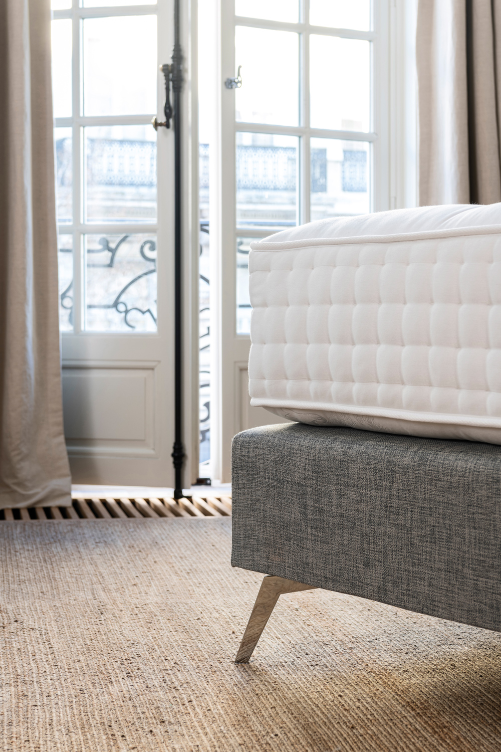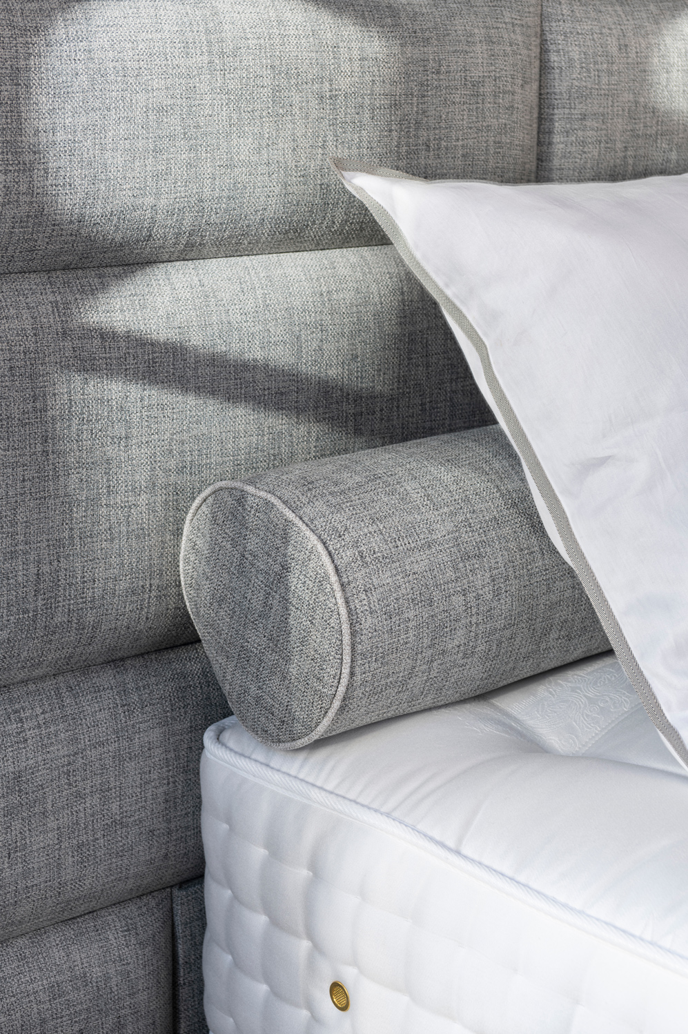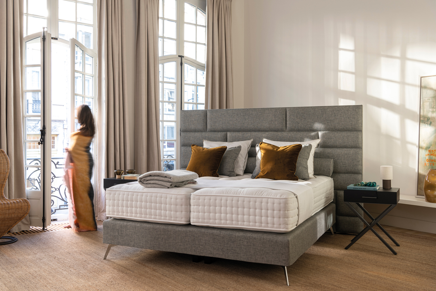 Das Modell verkörpert geradlinige Eleganz. Die Kombination aus textiler Struktur und klaren Formen fungiert als eleganter Eyecatcher im Schlafzimmer. Das großzügige Kopfteil mit seinen geometrischen Details verleiht dem Raum Struktur und kann sowohl an der Wand als auch frei im Raum positioniert werden, wodurch Sie maximale Gestaltungsfreiheit genießen. Grazile Bettfüße und reduziertes Design für den Bettrahmen schenken dem Modell elegante Leichtigkeit.