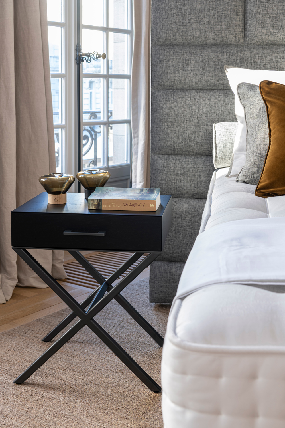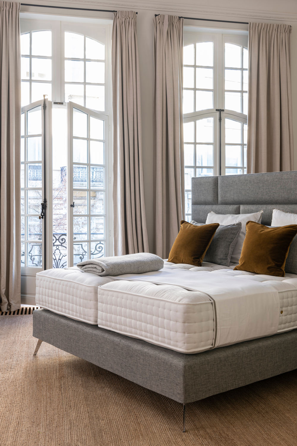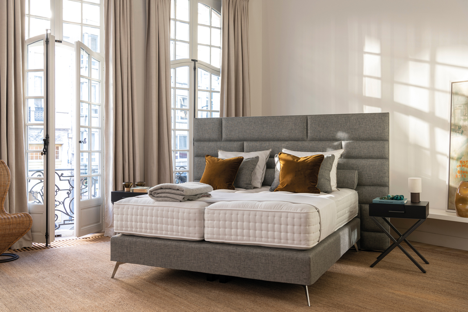 Das Modell verkörpert geradlinige Eleganz. Die Kombination aus textiler Struktur und klaren Formen fungiert als eleganter Eyecatcher im Schlafzimmer. Das großzügige Kopfteil mit seinen geometrischen Details verleiht dem Raum Struktur und kann sowohl an der Wand als auch frei im Raum positioniert werden, wodurch Sie maximale Gestaltungsfreiheit genießen. Grazile Bettfüße und reduziertes Design für den Bettrahmen schenken dem Modell elegante Leichtigkeit.