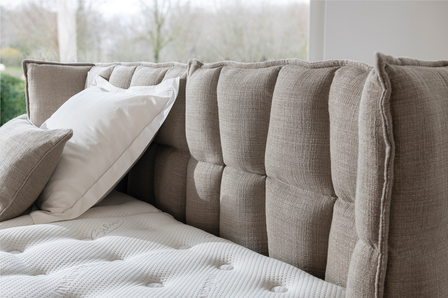 Einzigartig ist das Design von diesem Modell – das Kopfteil mit seinen Steppungen und Stegnähten sowie der auffälligen Formgebung wirkt wie ein Kokon für entspannte Stunden. Ohne schwer zu wirken, hüllt die Form des Kopfteils Sie in Entspannung und Behaglichkeit. In Kombination mit dem geradlinigen Bettrahmen und den eleganten Bettfüßen entfaltet dieses Bettgestell eine faszinierende Raumwirkung.
