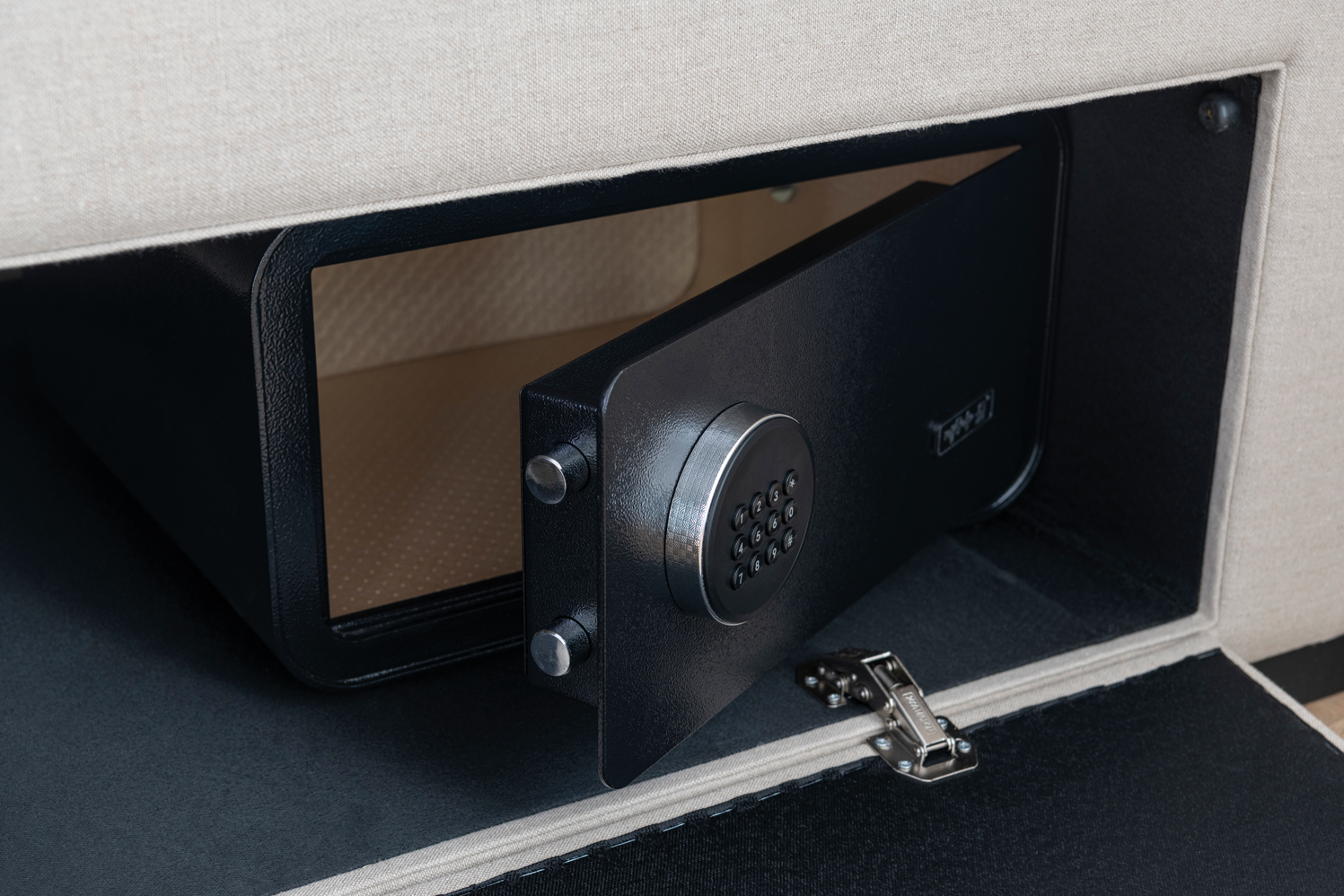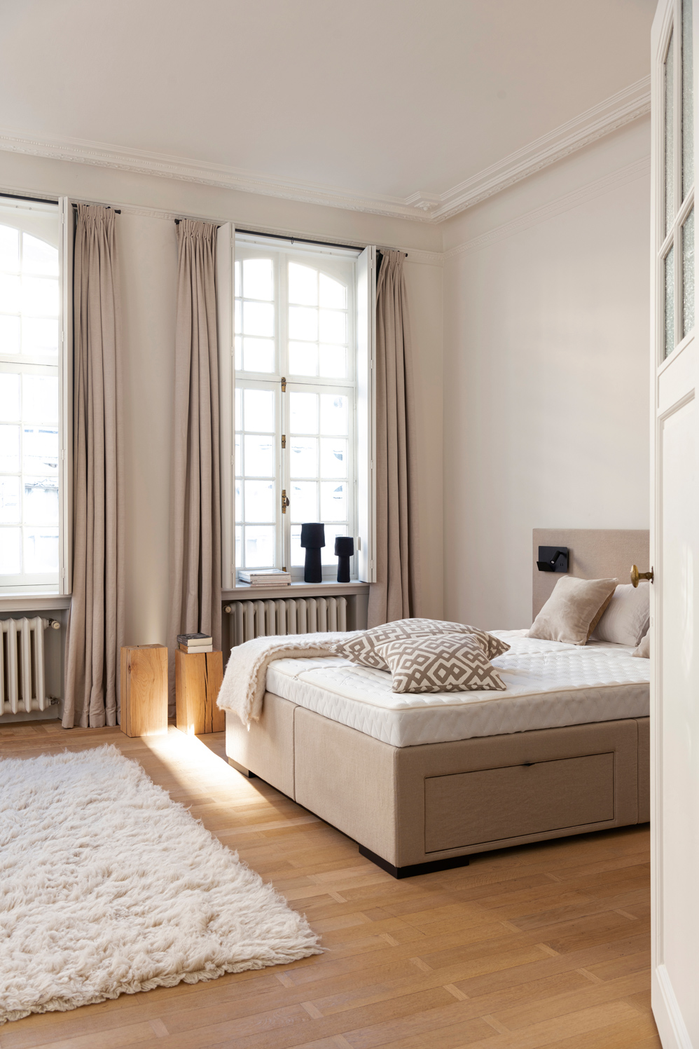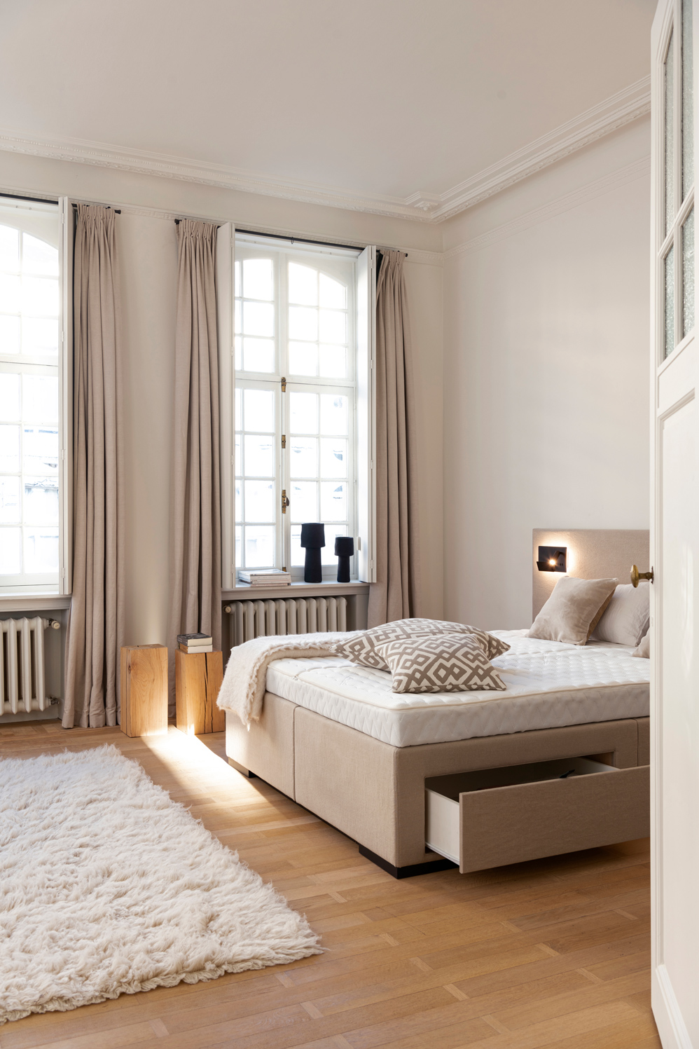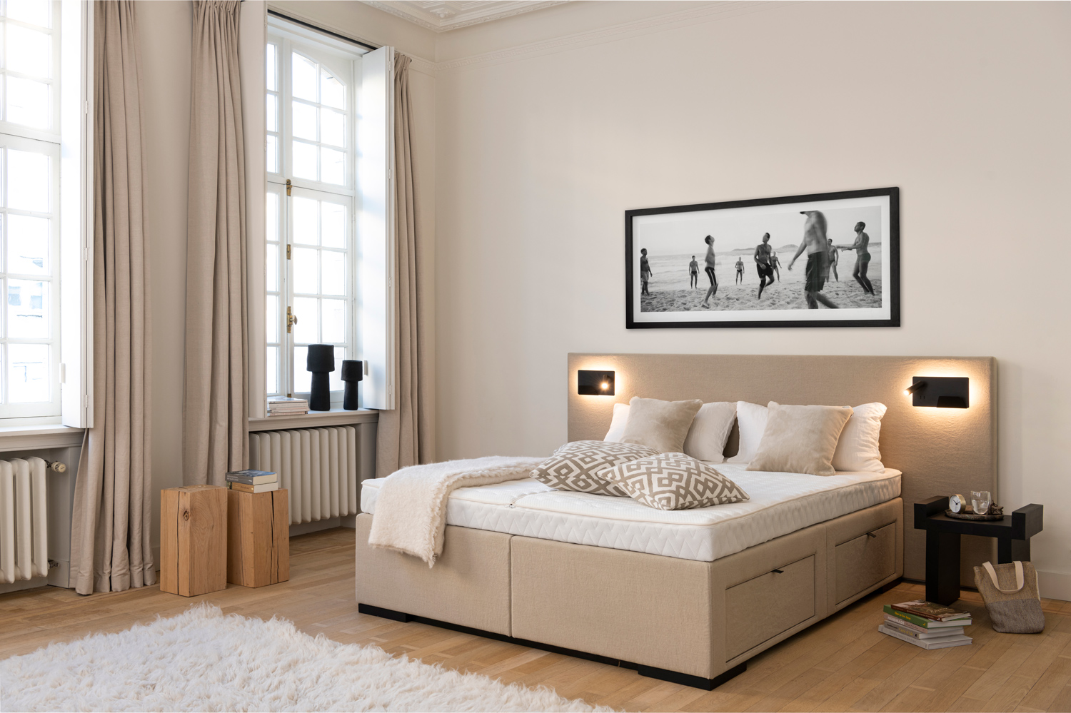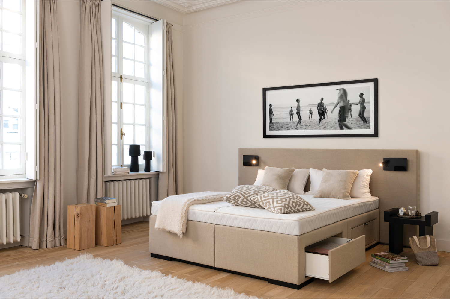 Zurückhaltende Eleganz beschreibt die klassische Formgebung dieses Bettgestells mit seinem besonders breiten Kopfteil und den integrierten Bettschubladen. Dieser praktische Stauraum ist nicht die einzige Raffinesse, die sich hinter dem schlichten Design verbirgt. Die im Kopfteil integrierten Design-Lampen in mattem Schwarz bieten Hintergrundbeleuchtung, Leselampe und eine USB-Schnittstelle zum Aufladen von Smartphones oder Tablets. Klare Formen und maximale Funktionalität werden Sie auf ganzer Linie überzeugen.