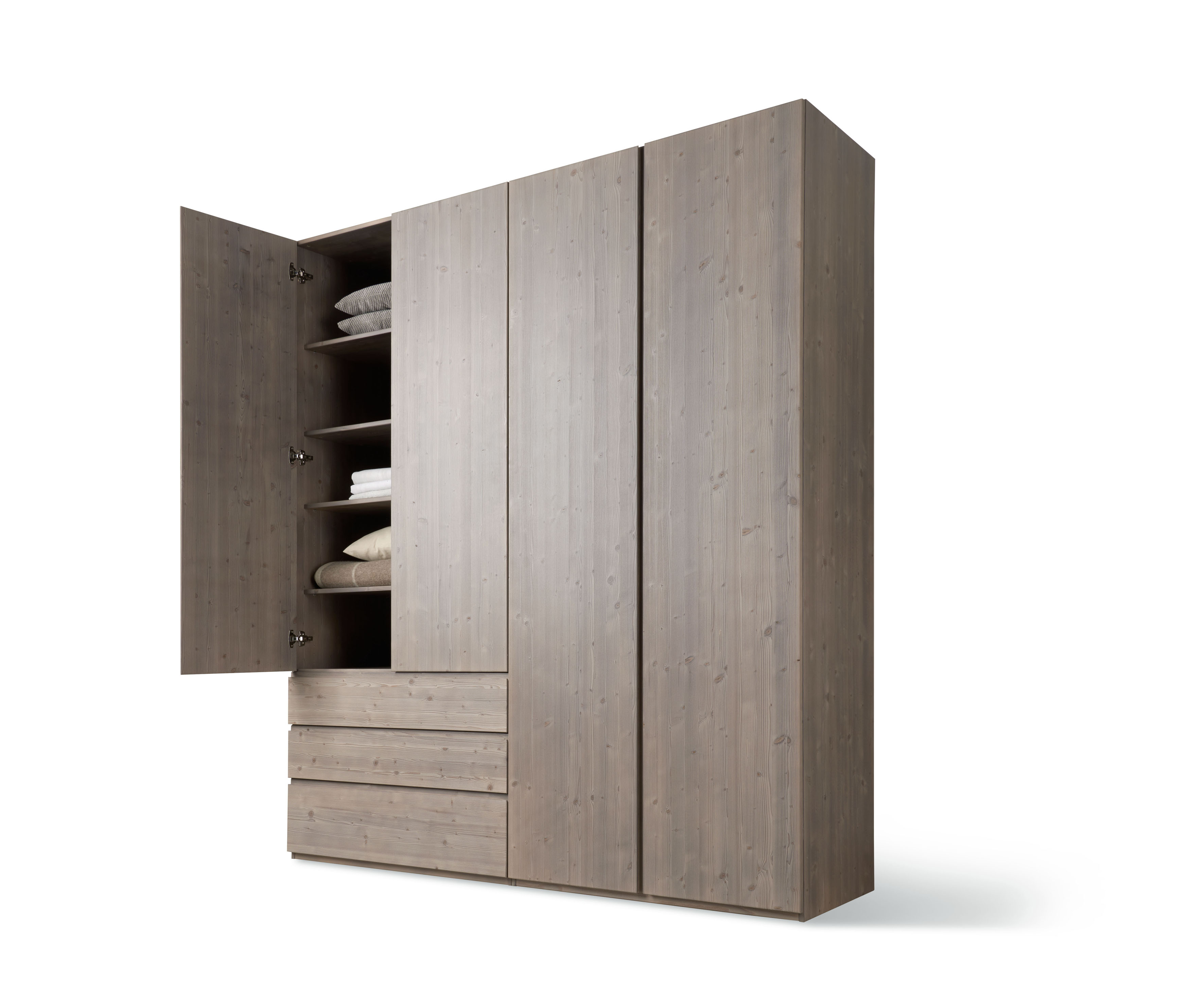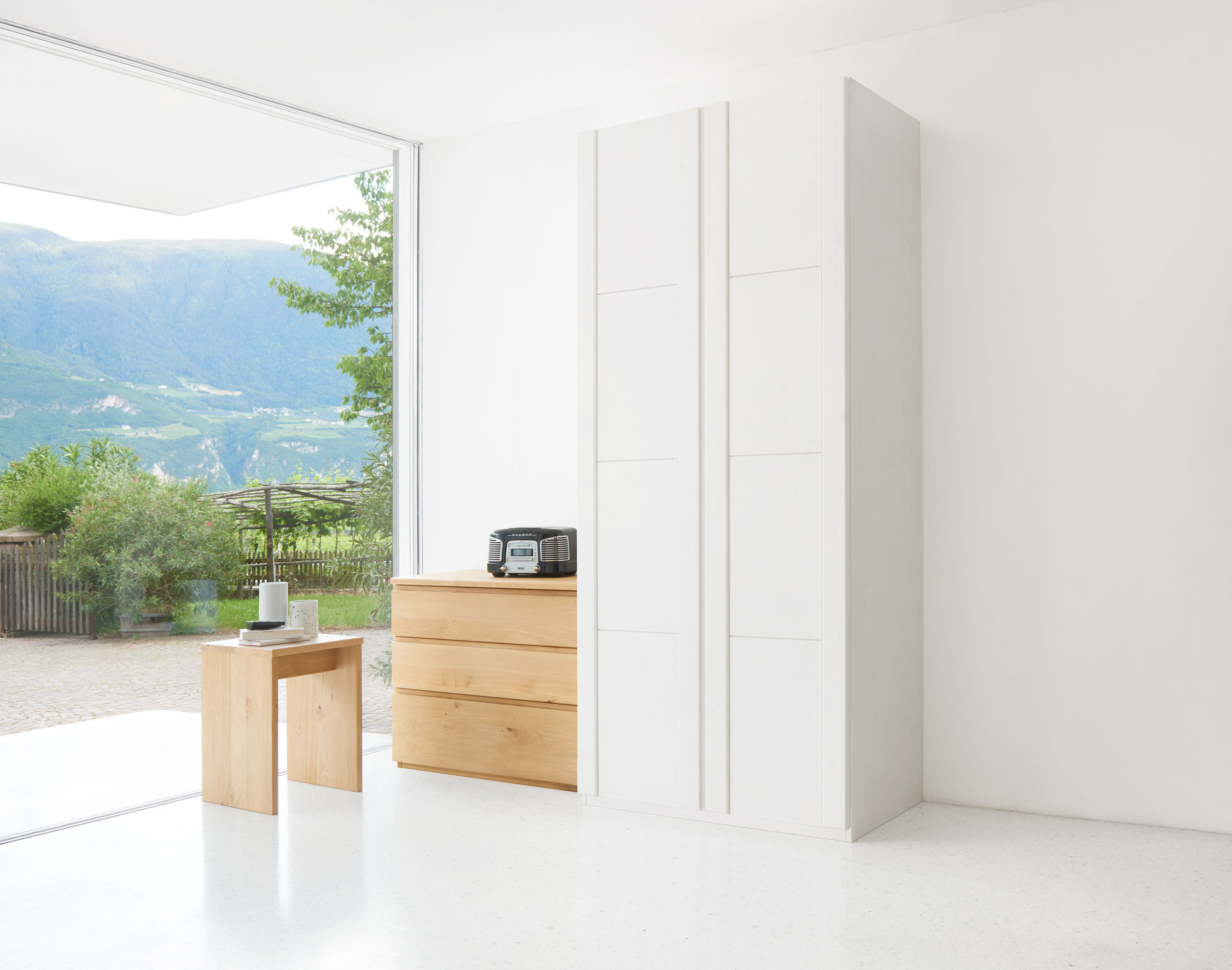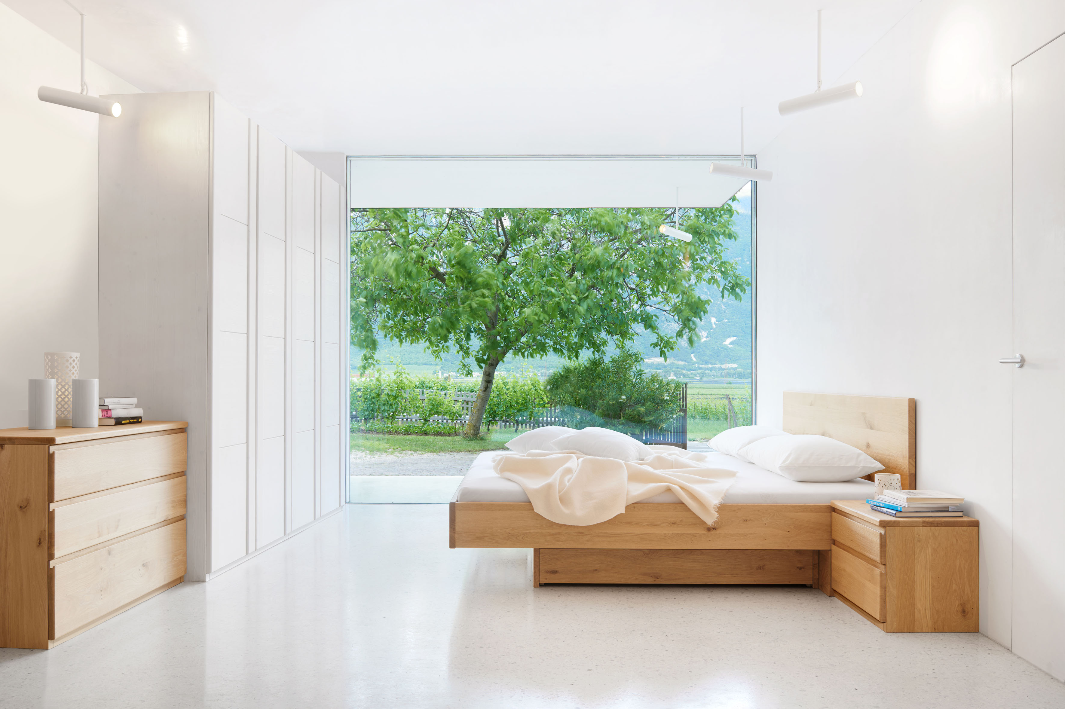 Bestechend schnörkellos: Diese Schlafzimmer-Linie schafft ruhige Harmonie und lädt zum Spiel mit Oberflächen und Materialien ein. Für eine geradlinige Optik sind die Griffe ins Naturholz gefräst. Eine Bettschublade bietet unsichtbaren Stauraum. Sideboards, Nachttische, Kleiderschränke und ein Bett mit vielfältigen Kopfteilformen – gemeinsam bilden diese Möbel ein stimmiges Ensemble für ruhige Harmonie im Schlafbereich.
