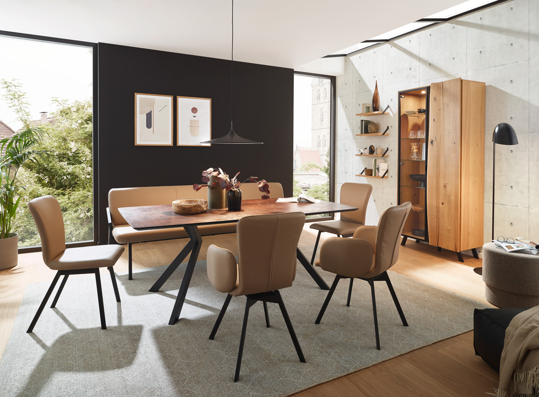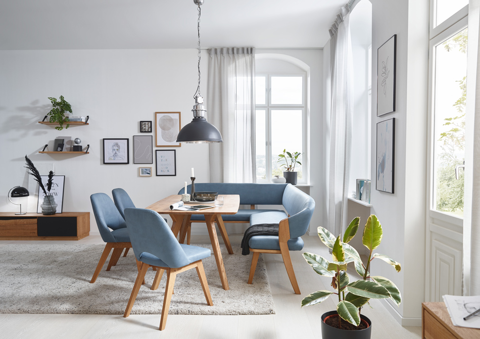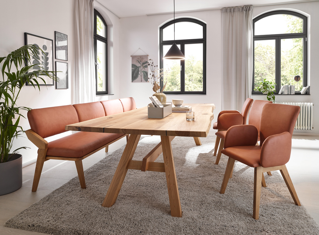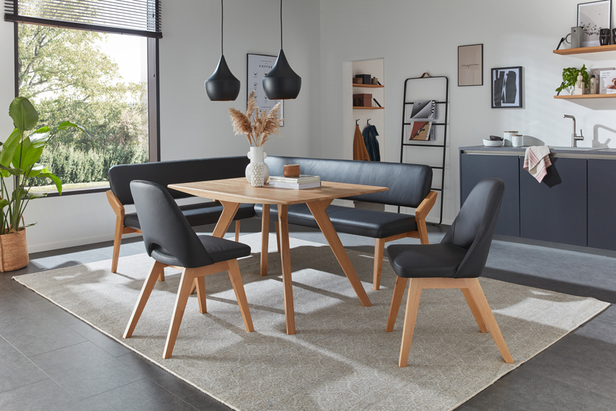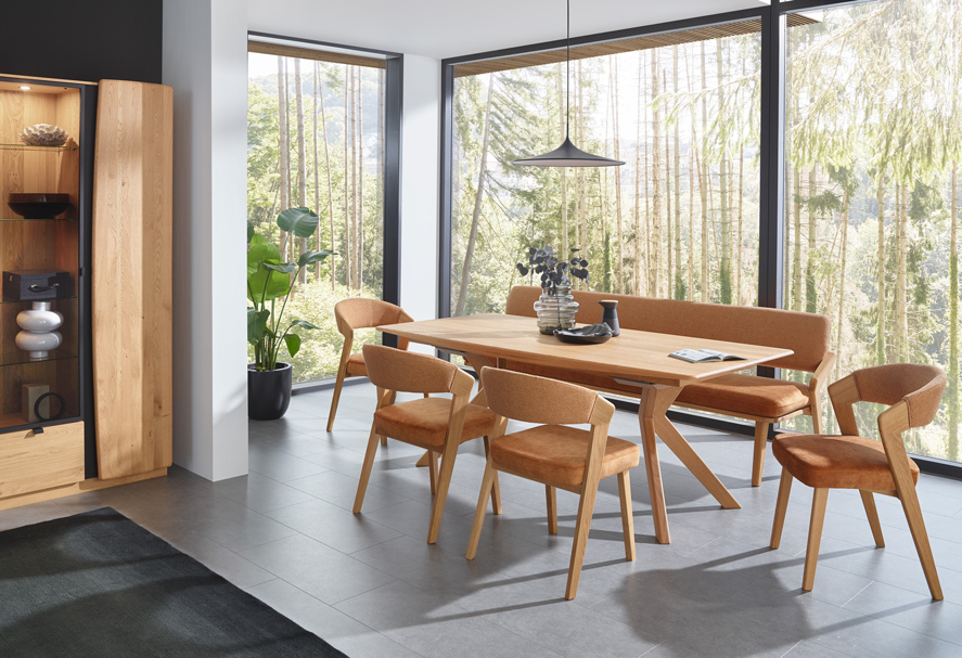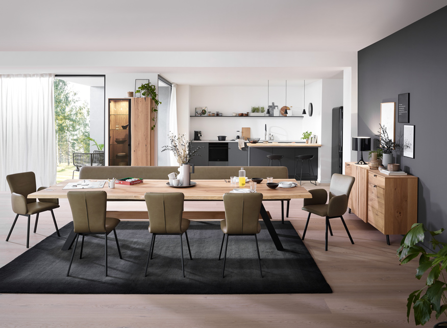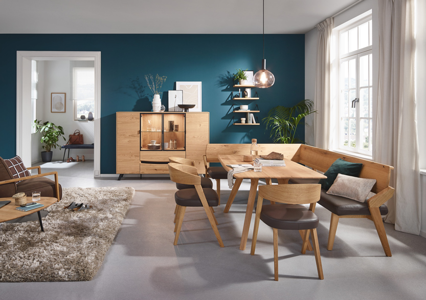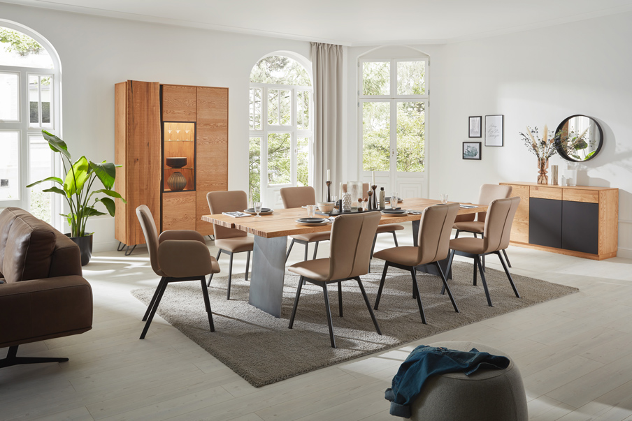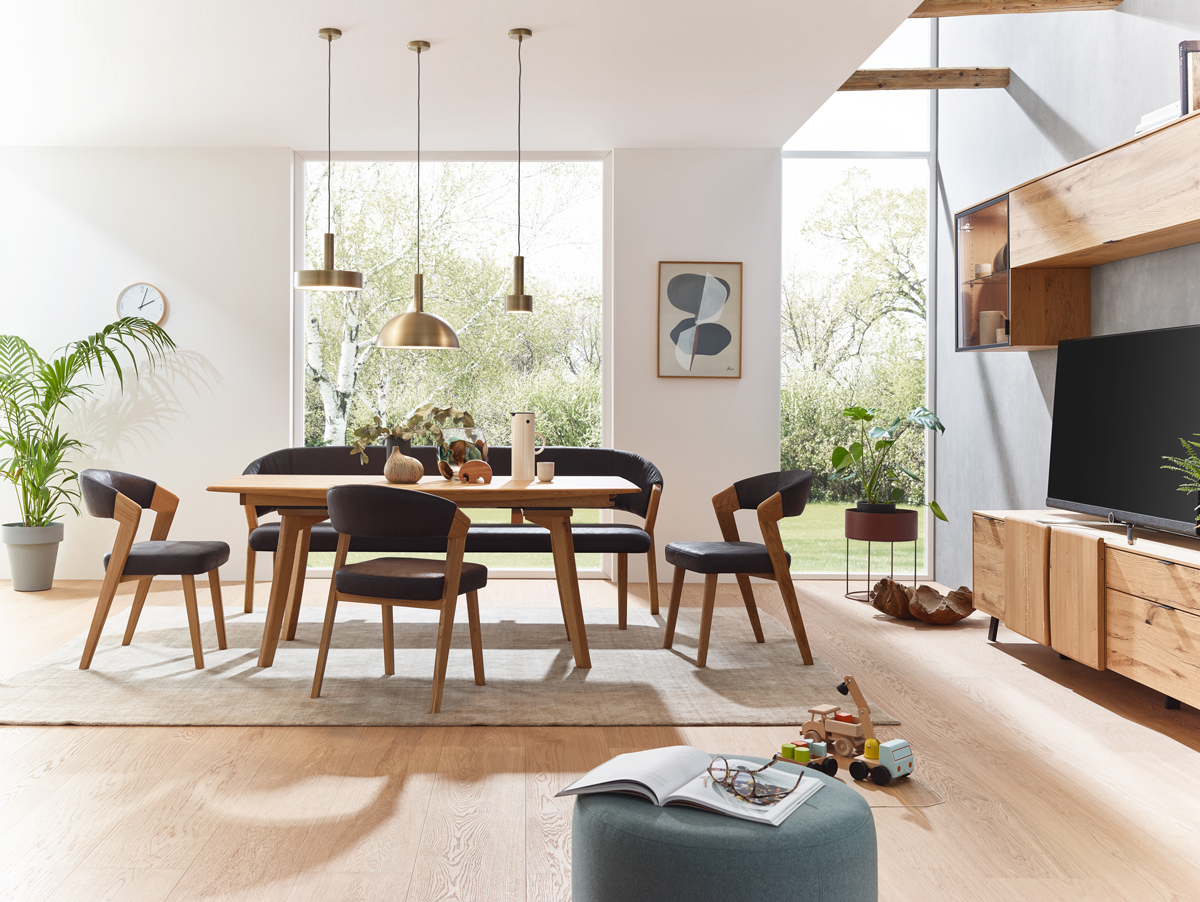 Diese Esszimmermöbel aus heimischer Fertigung verbinden Eleganz in der Linienführung mit der urwüchsigen Maserung der Eiche. Kombinieren Sie Esstisch, Stühle, Sitzbänke und wichtige Ergänzungsmöbel wie Sideboards und Vitrinen zu einem Gesamtkonzept mit außergewöhnlichem Charme und beständiger Qualität. Die vielen Varianten schenken maximalen Gestaltungsspielraum für ein Esszimmer mit individuellem Esprit.