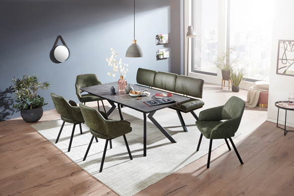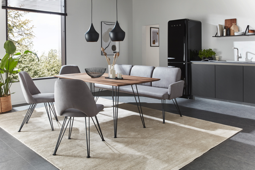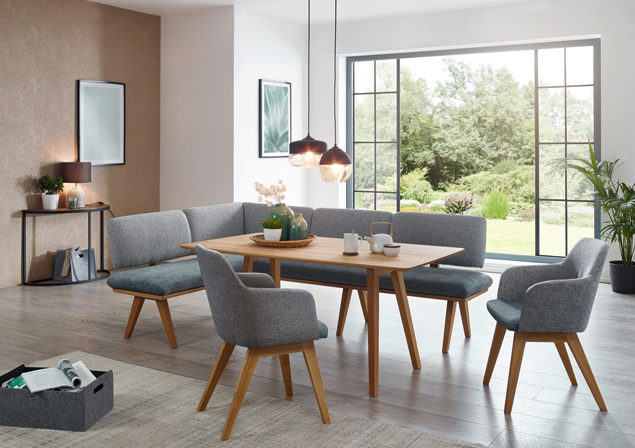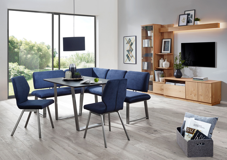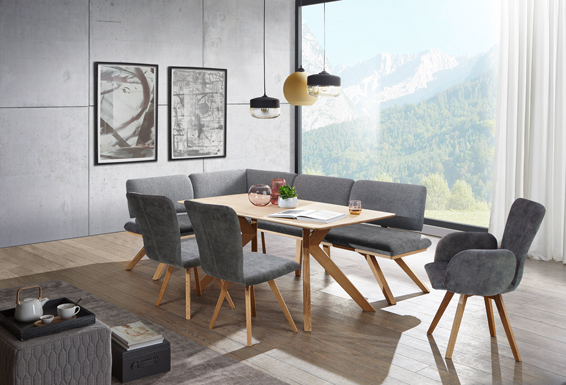 Wer beim Essgruppen-Design aus dem Vollen schöpfen will, wird von dieser vielfältigen Esszimmer-Linie begeistert sein! Aus vier Esstischformen, drei Tischkantenvarianten und sieben Gestellformen kombinieren Sie einen Esstisch als Unikat für Ihren Essbereich. Auch bei den Stühlen wählen Sie aus unterschiedlichen Sitzschalen- und Gestellformen. Diese Vielfalt wird auch für die individuelle Ausführung von Sitz- und Eckbänken geboten.