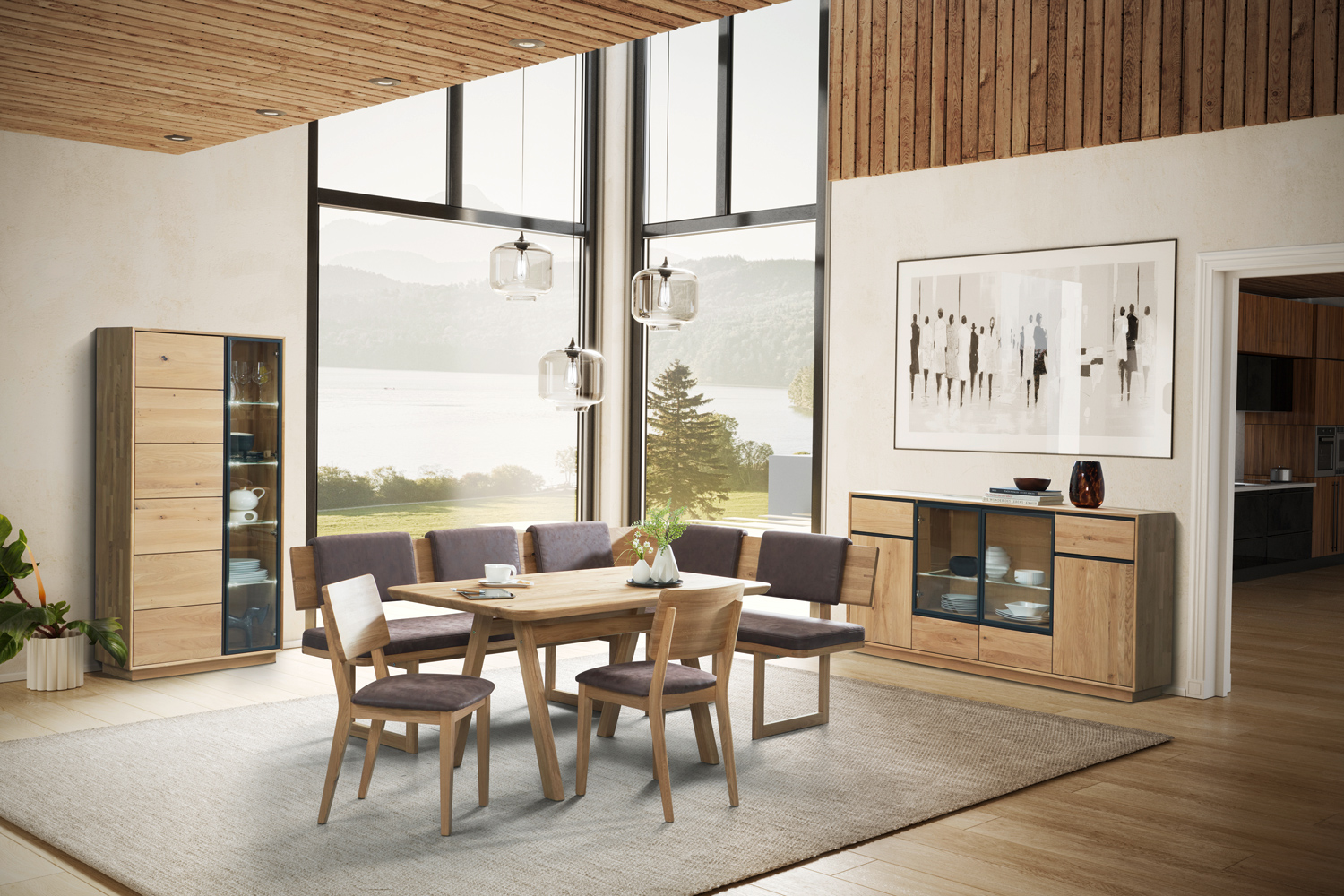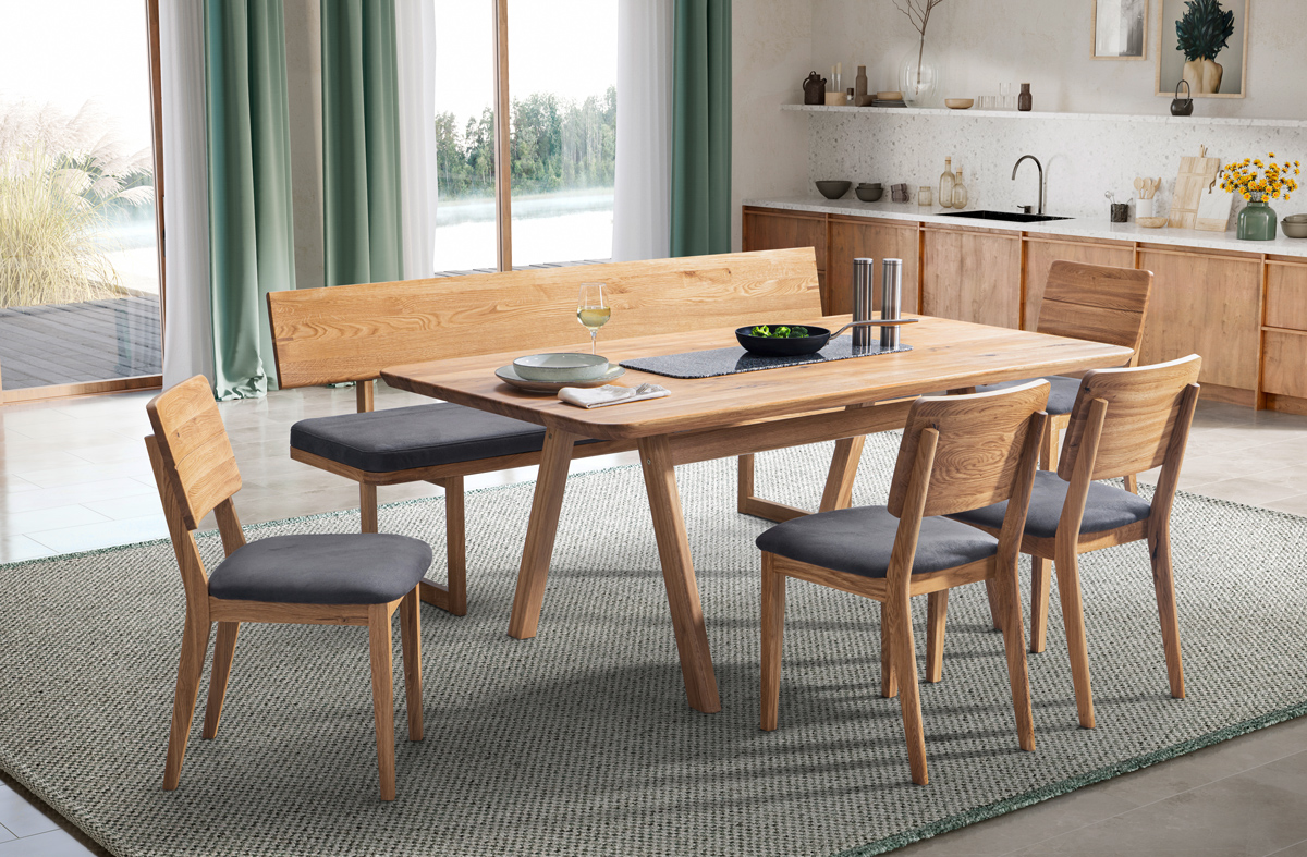 Diese Essgruppe setzt die natürliche Ästhetik der Wildeiche raffiniert in Szene. Durch abgerundete Ecken erhält das geradlinige Design einen spannenden Twist. So entsteht eine zeitlose Formensprache, die einen modernen Look mit Beständigkeit verbindet. Der Esstisch ist in vielen Größen sowie mit einem Synchron-Mittelauszug erhältlich. Die Sitzbank können Sie als klassische Bank oder Eckbank ausführen lassen. Mit der großen Stoffauswahl für die Polsterflächen verleihen Sie Ihrer neuen Essgruppe einen individuellen Touch, der zu Ihrem Wohnstil passt.