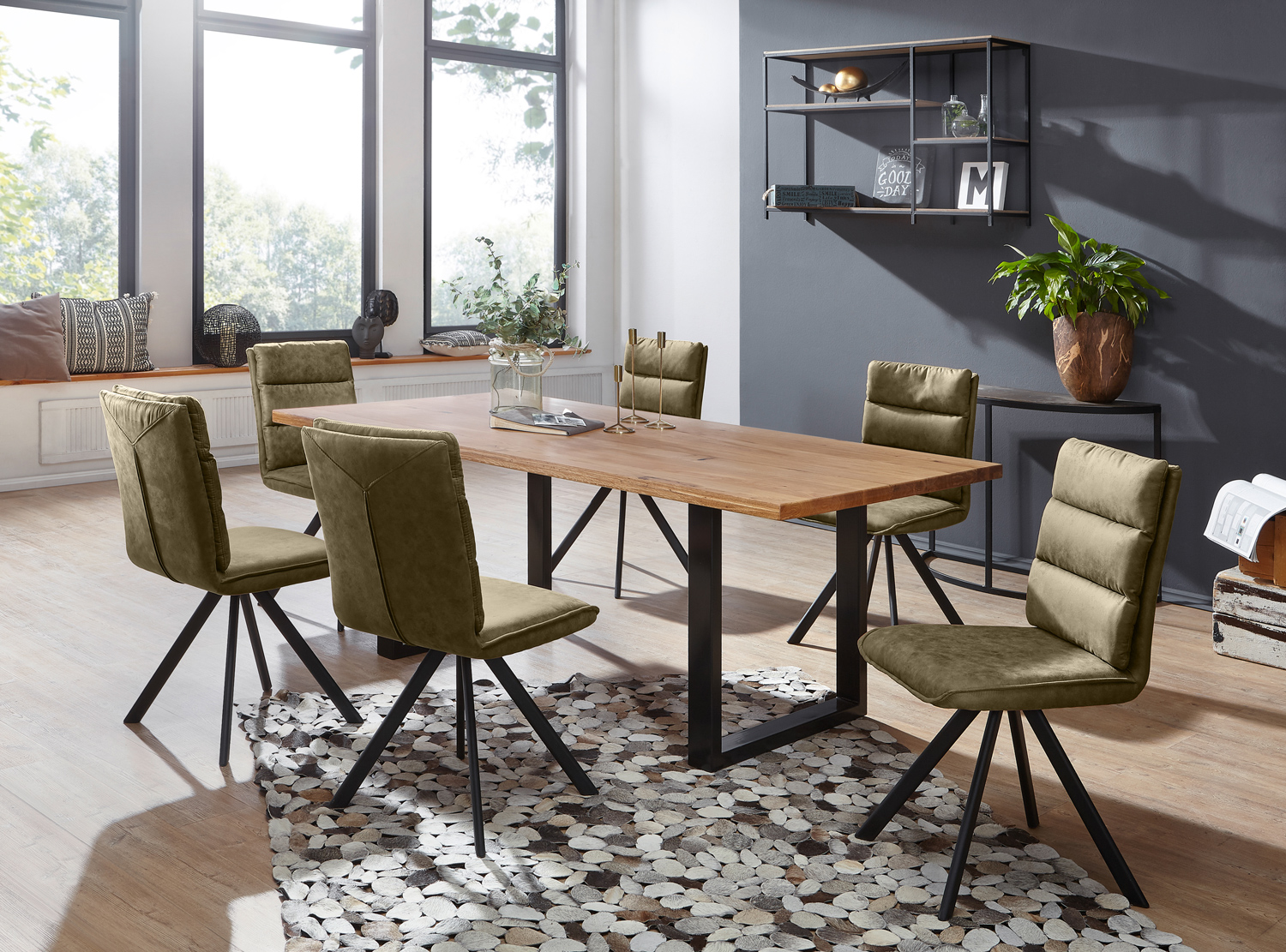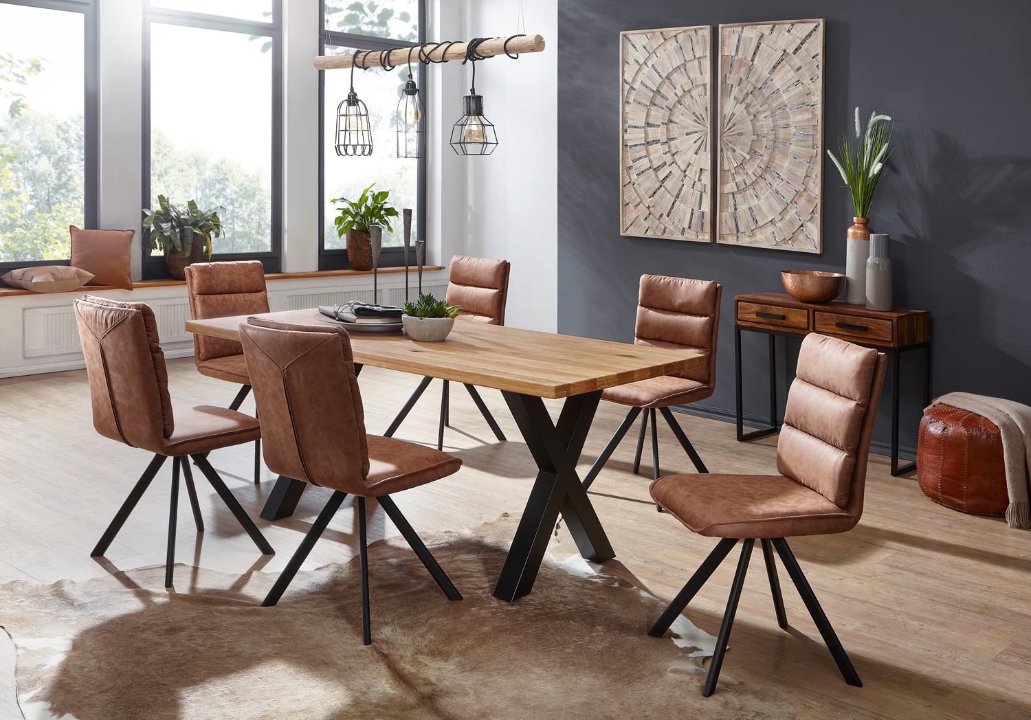 Dieser Esstisch rückt die massive Wildeiche ins Zentrum des Designkonzepts. Das Fußgestell aus schwarzem Metall setzt einen gelungenen Kontrast zum natürlichen Werkstoff Holz. Sie haben die Wahl zwischen einem geradlinigen Kufengestell oder einem auffälligen x-förmigen Tischgestell.