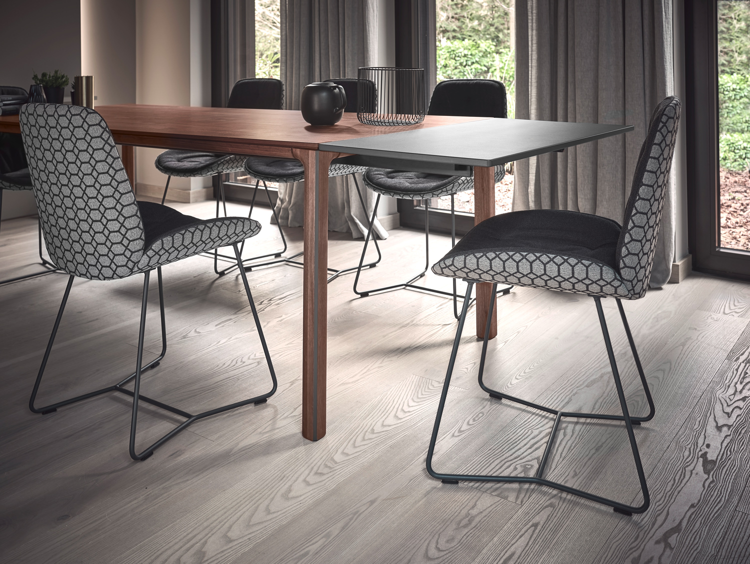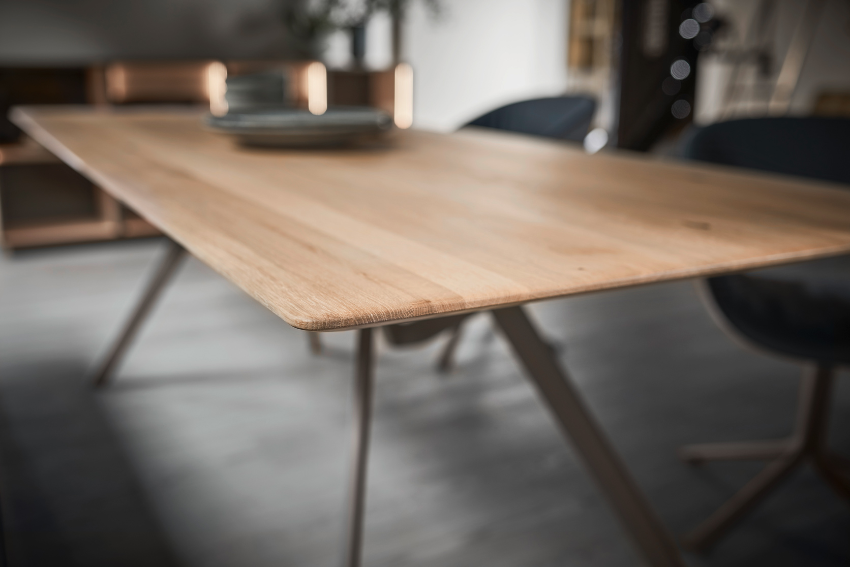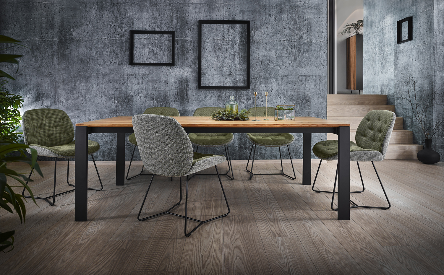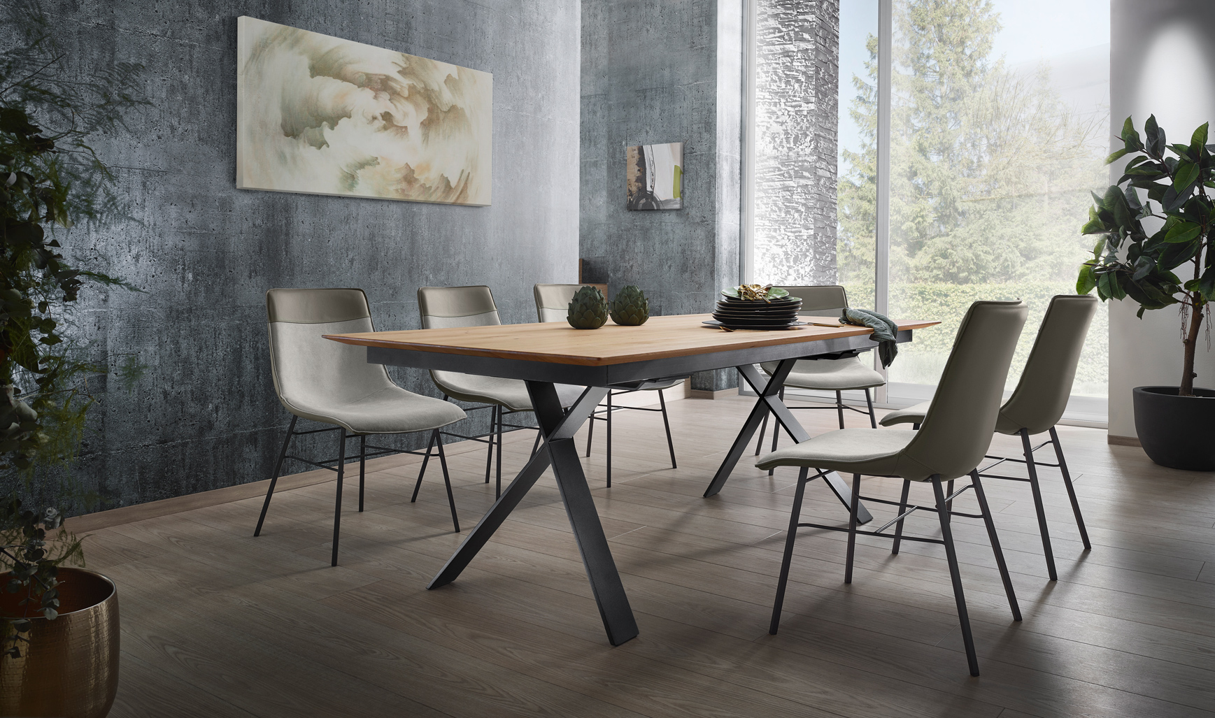Diese Esszimmerkollektion schafft den Spagat: Die massiven Werkstoffe Holz und Metall werden in grazilen Linien zu einem Ensemble moderner Leichtigkeit verbunden. Das reduzierte Design fügt sich stilvoll in moderne Wohnkonzepte ein. Unaufgeregt und doch fesselnd!