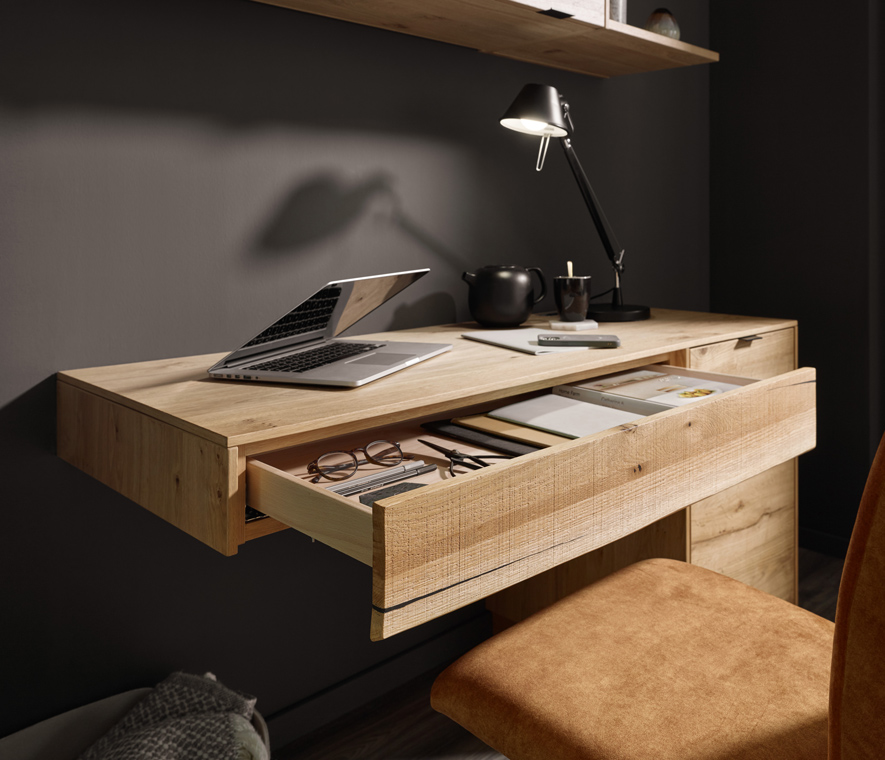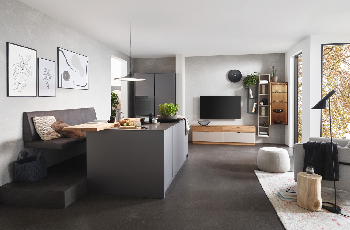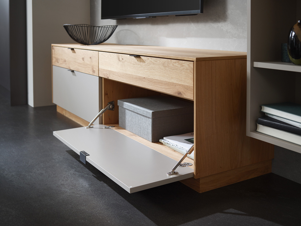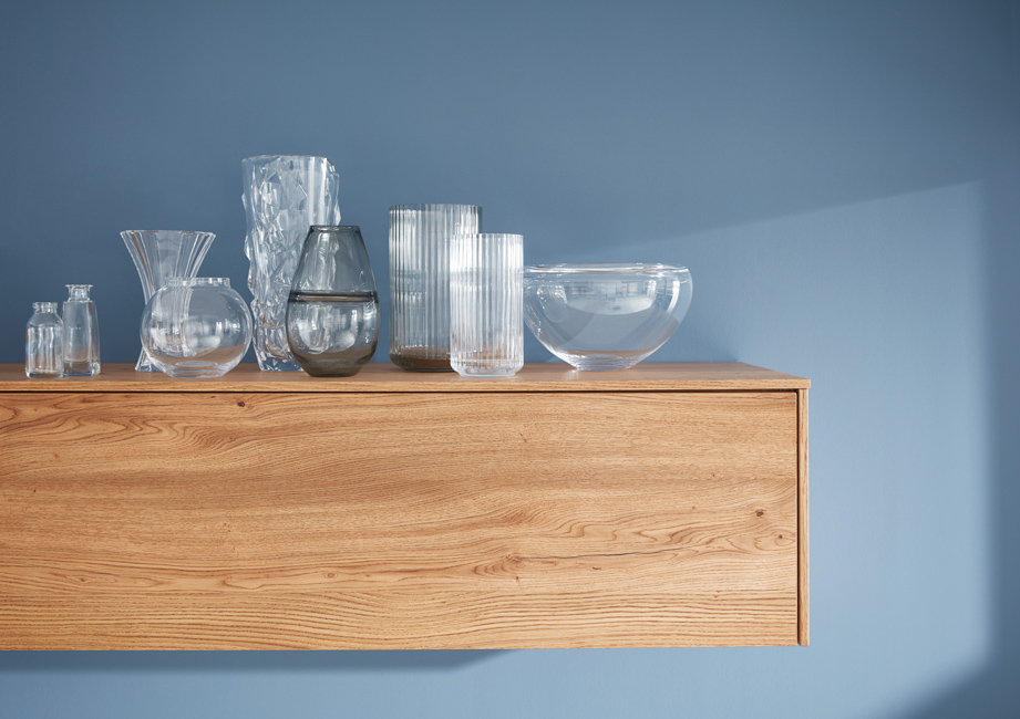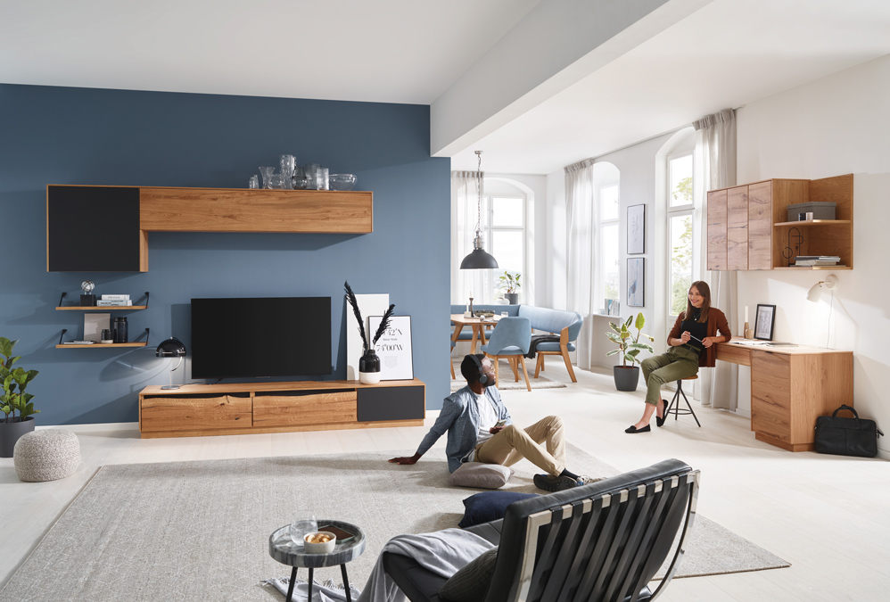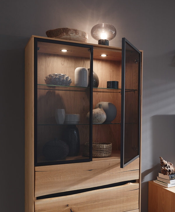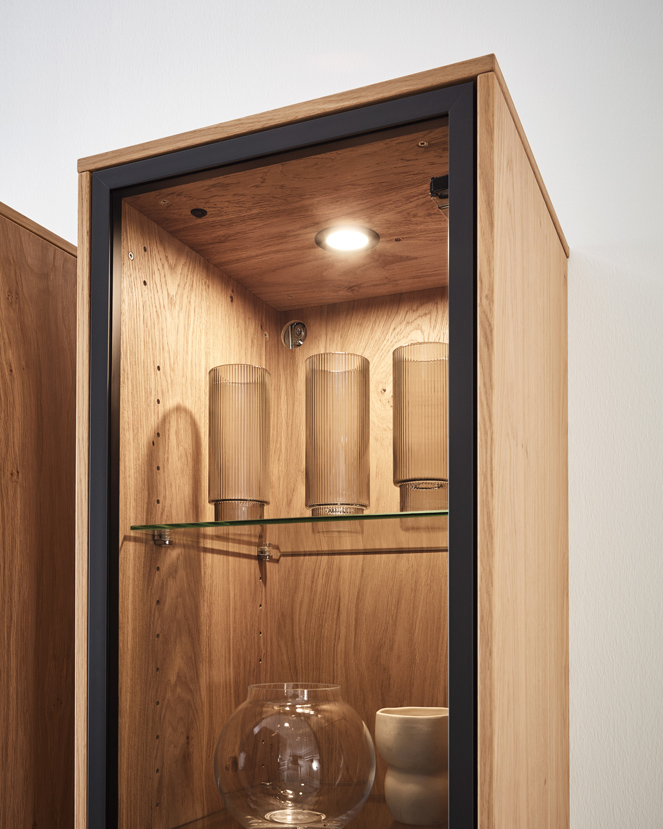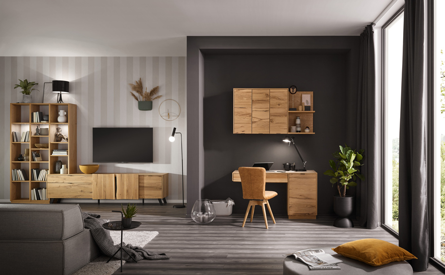 Aus über 100 Einzelteilen erschaffen Sie Ihre individuelle Vision der Wohnraumgestaltung. Wohn- und Essbereiche, Garderoben und Homeoffice-Arbeitsplätze – alles ist möglich! Neben den unzähligen Einrichtungsvarianten besticht diese stilvolle Möbellinie besonders mit detailverliebtem Interior-Design. Feinsinniges wie Designfronten mit Waldkante, integrierte Beleuchtung sowie luftige Wandkonsolen und Glasvitrinen verleihen Ihrem Wohnkonzept Exklusivität nach Ihren persönlichen Vorstellungen.