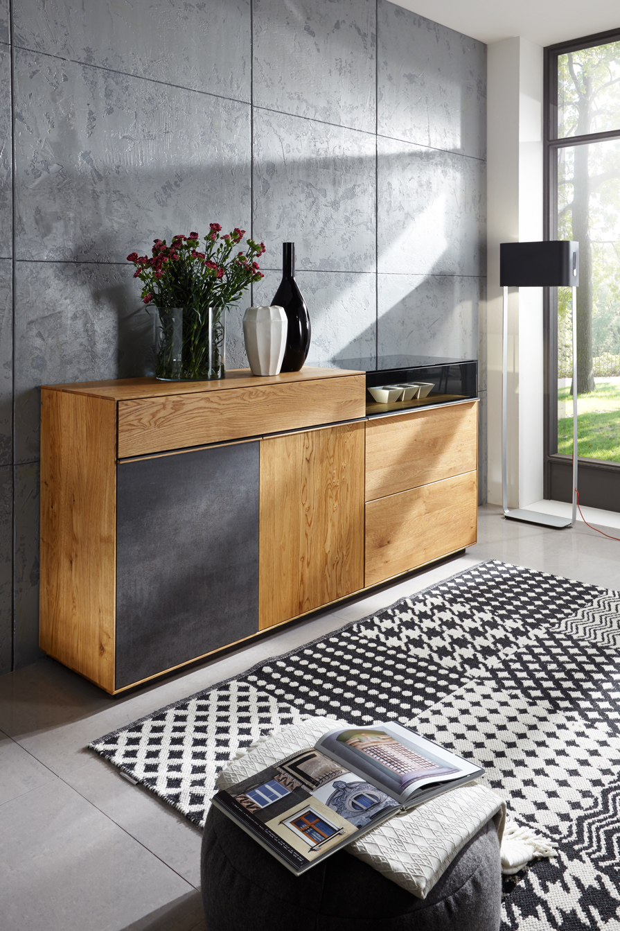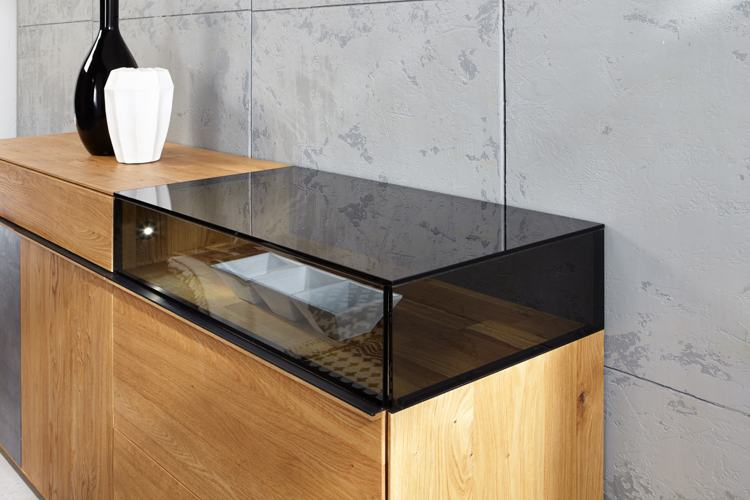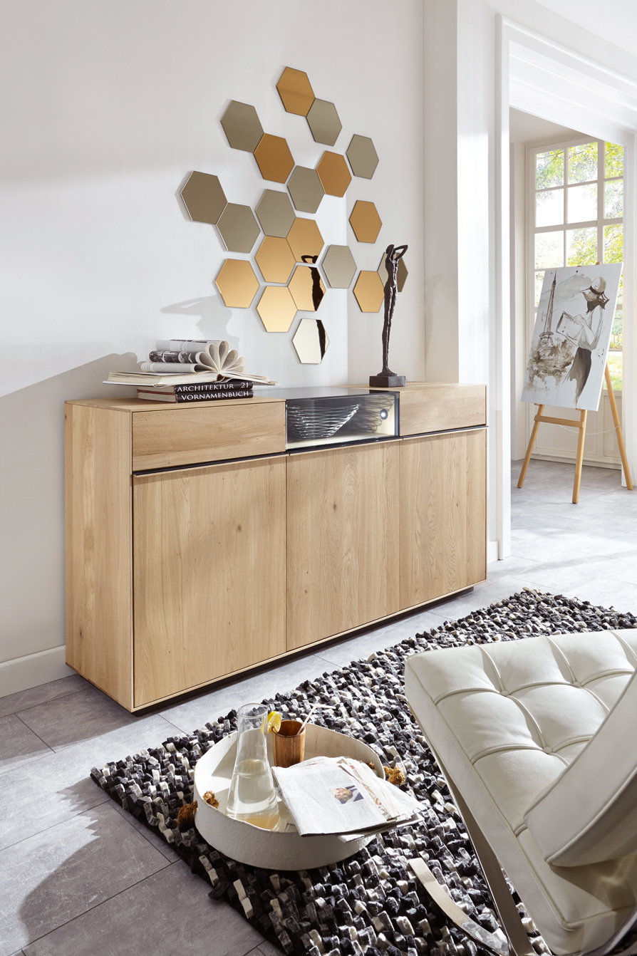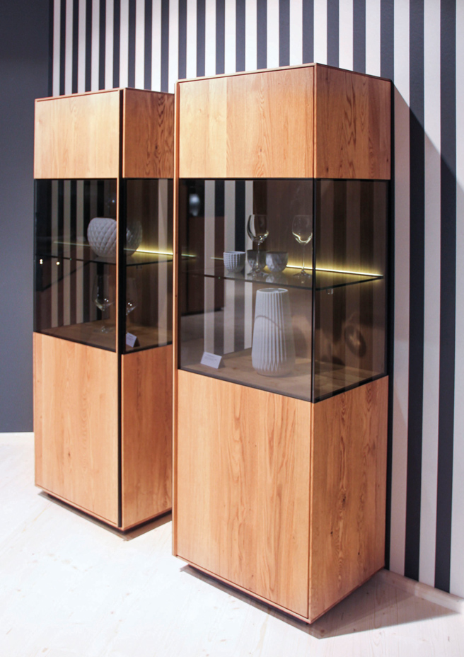 Diese Wohn-kollektion ist aus Massivholz gebaut und steht für modernen Lifestyle ohne Kompromisse. Der Rohstoff wird ausschließ-lich mit natürlichen Ölen behandelt. Das Design ist klar und schnörkellos, die Einzelmöbel sind harmonisch kombinierbar. Für überraschende Effekte sorgen Kuben aus wertigem Grauglas, die flächenbündig zum Holz übergehen. In ihnen wirken extravagante Vasen und Schalen oder Modellautos mit Erinnerungswert so reizvoll wie Ausstellungsstücke in einer Galerie, von integrierten Spots stimmungsvoll beleuchtet. Glaskuben am Eck lassen die Objekte im Inneren schwebend erscheinen. Dazu passen die schlichten Griffe aus Holz und Metall.