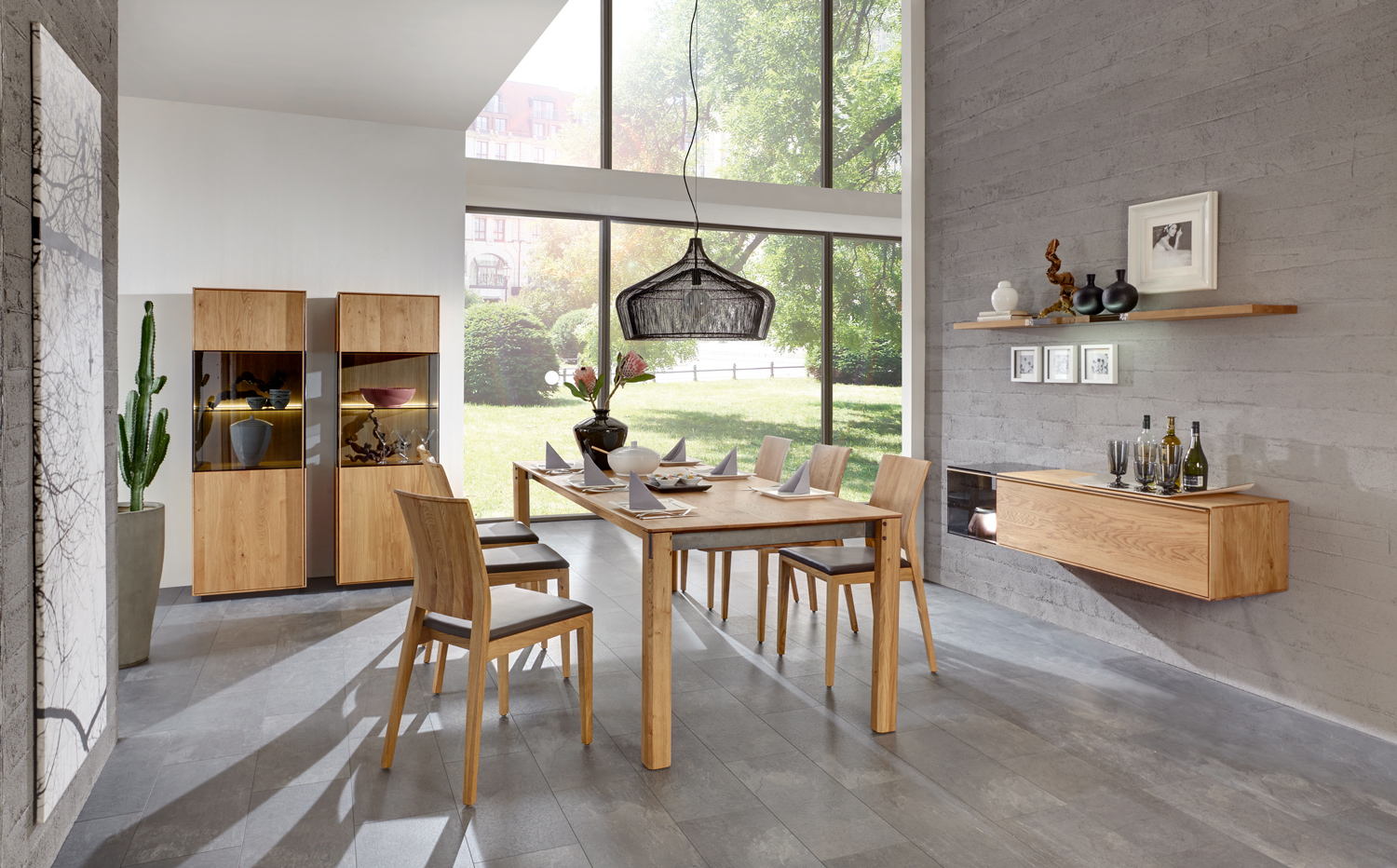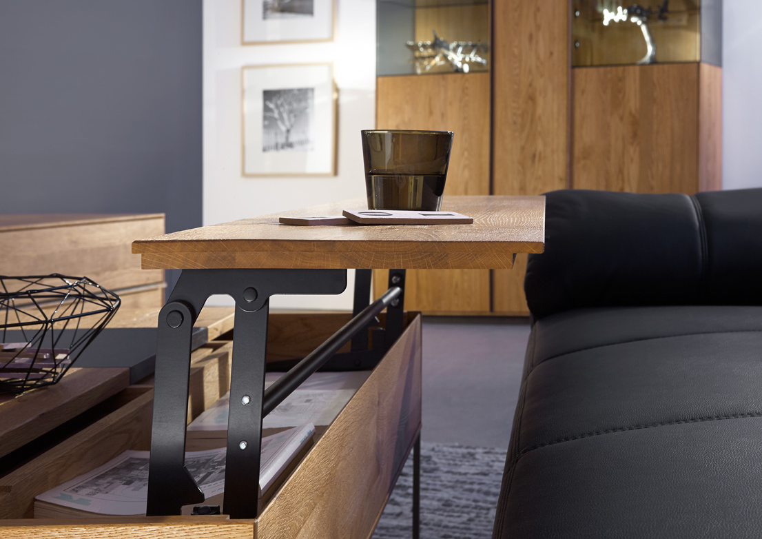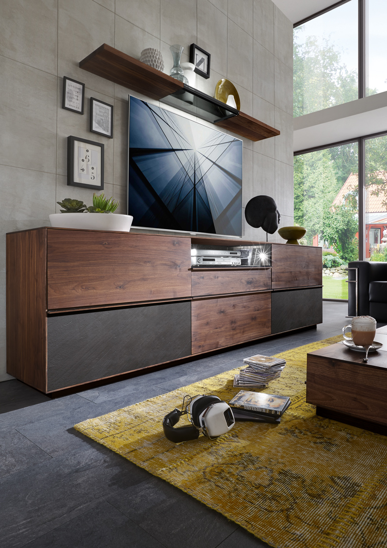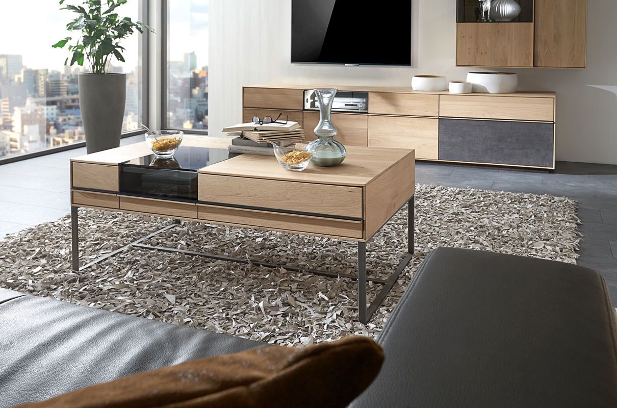 Diese Wohn-kollektion ist aus Massivholz gebaut und steht für modernen Lifestyle ohne Kompromisse. Der Rohstoff wird ausschließ-lich mit natürlichen Ölen behandelt. Das Design ist klar und schnörkellos, die Einzelmöbel sind harmonisch kombinierbar. Für überraschende Effekte sorgen Kuben aus wertigem Grauglas, die flächenbündig zum Holz übergehen. In ihnen wirken extravagante Vasen und Schalen oder Modellautos mit Erinnerungswert so reizvoll wie Ausstellungsstücke in einer Galerie, von integrierten Spots stimmungsvoll beleuchtet. Glaskuben am Eck lassen die Objekte im Inneren schwebend erscheinen. Dazu passen die schlichten Griffe aus Holz und Metall.