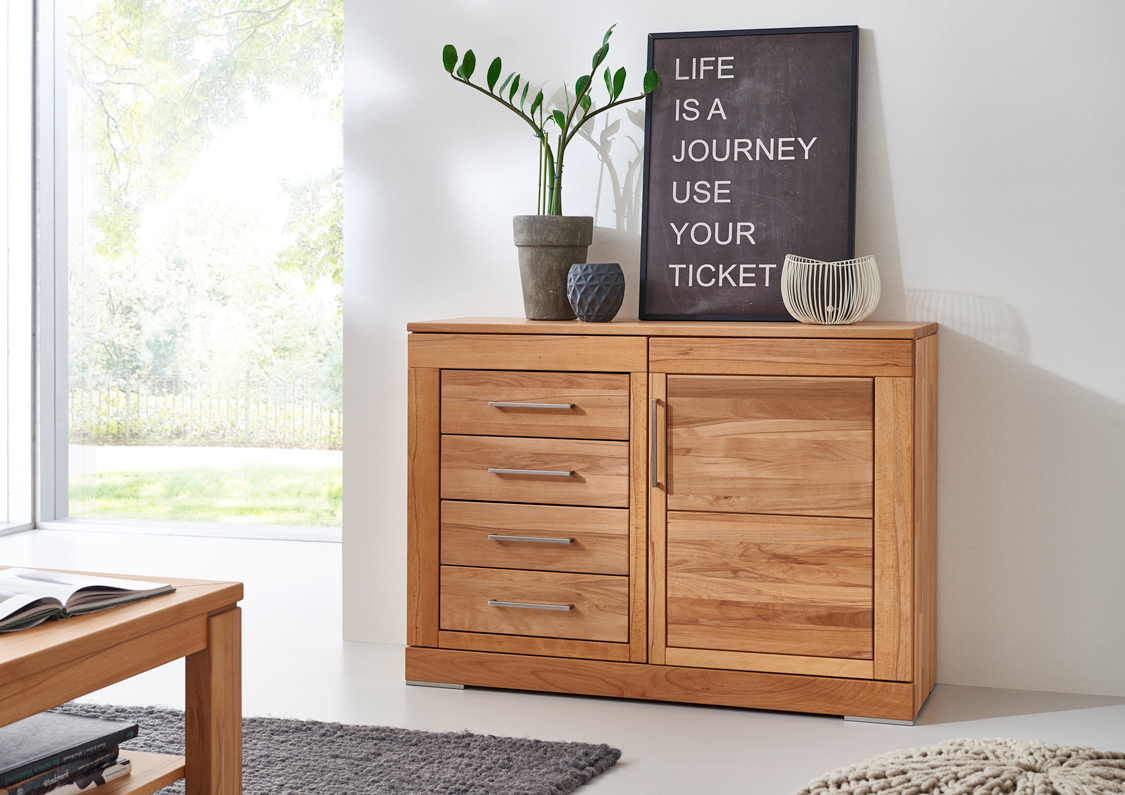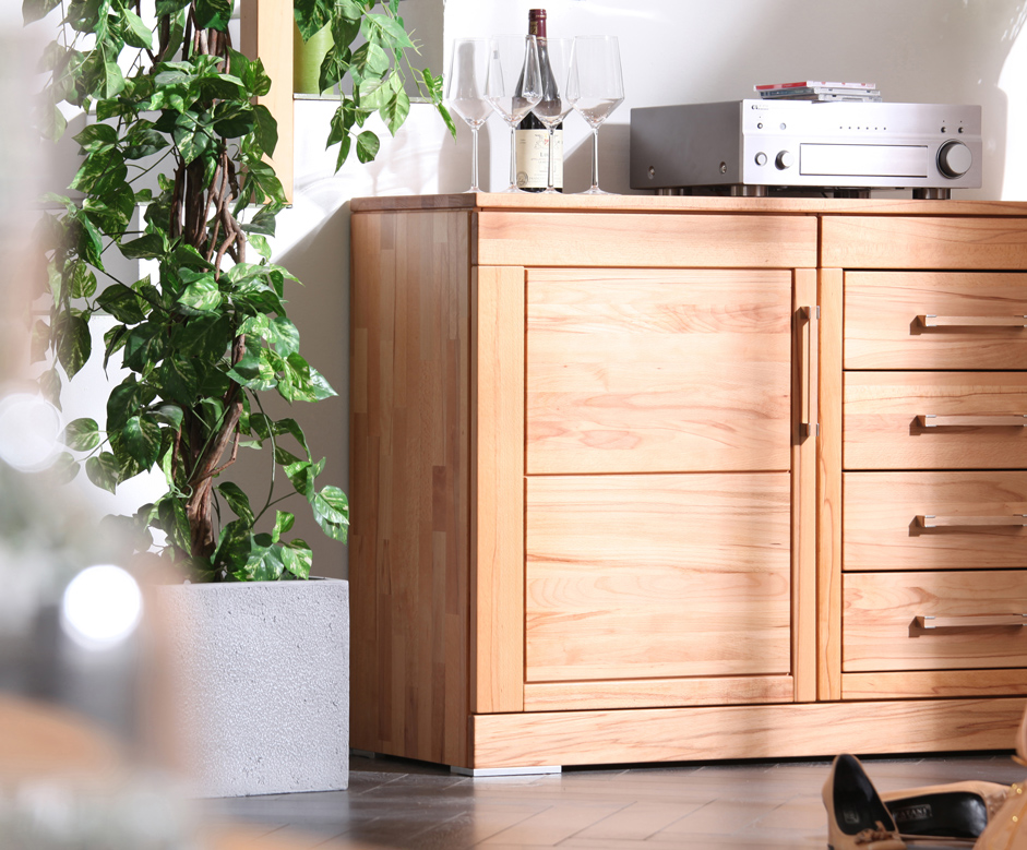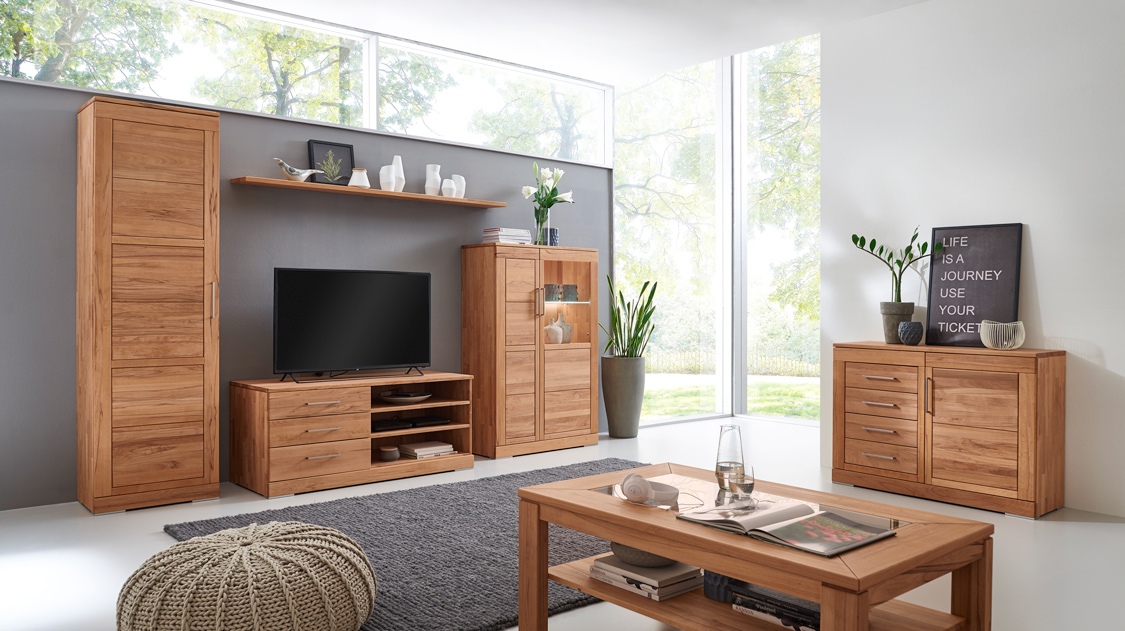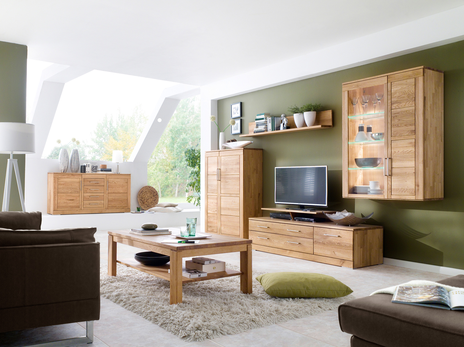 Eine Wohnzimmer-Kollektion für echte Massivholz-Liebhaber! Diese Massivholzmöbel verwandeln Ihr Wohnzimmer in eine natürliche Wohlfühloase. Auf den großflächigen Fronten können Sie die einzigartige Maserung des hochwertigen Holzes jeden Tag aufs Neue erleben und mit allen Sinnen genießen. Klare Formen und raffinierte Details unterstreichen die Wirkung des natürlichen Looks.