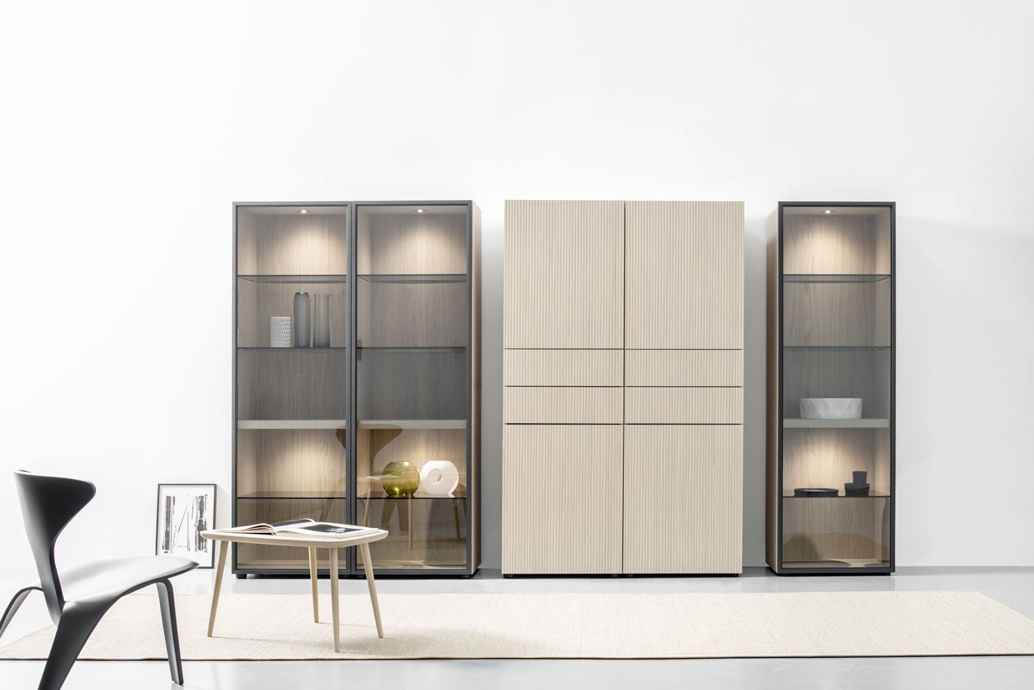 Stauraum mit Stil wirkt luftig – leicht und elegant. Für den Wohn- und Essbereich wird Funktionalität gekonnt in edle Entwürfe übersetzt, die sich ästhetisch ins Interior-Konzept einfügen. Integrierte Beleuchtung setzt Accessoires in Szene und rundet das Ambiente in Wohnräumen stilvoll ab.