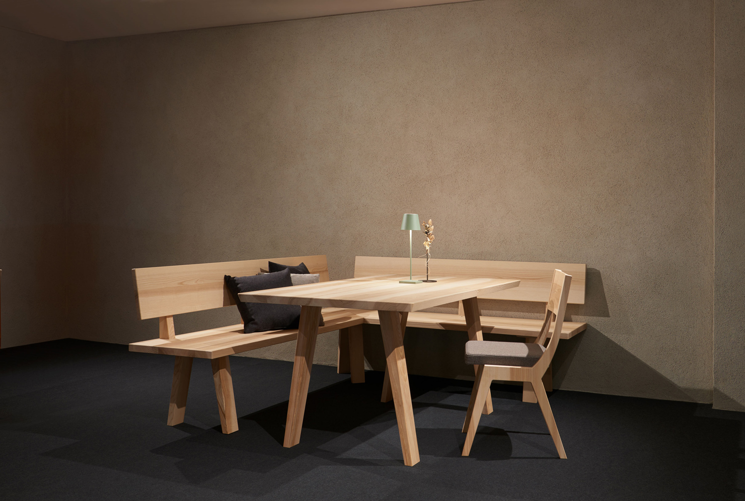 Kombinieren Sie einen massiven Esstisch aus Esche mit gepolsterten Esszimmerstühlen in schwungvoller Form. Die Eckbank wirkt durch die geteilte Rückenlehne luftig leicht, obwohl sie den Raum optimal nutzt und eine großzügige Sitzfläche schafft.